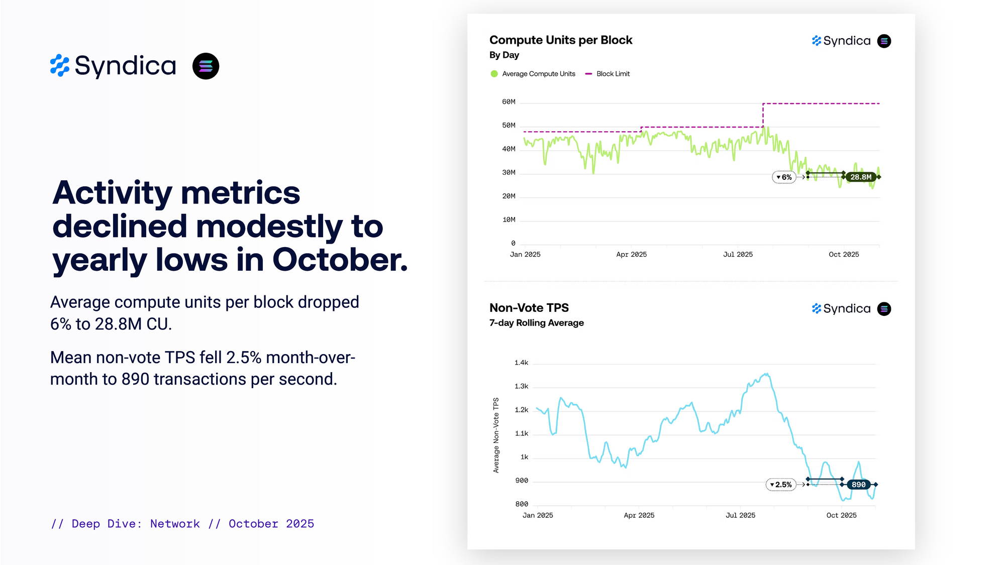 活动指标略有下降,达到 10 月份的年度低点。每个区块的平均计算单元数下降 6% 至 2880 万 CU。平均非投票 TPS 环比下降 2.5% 至每秒 890 笔交易。