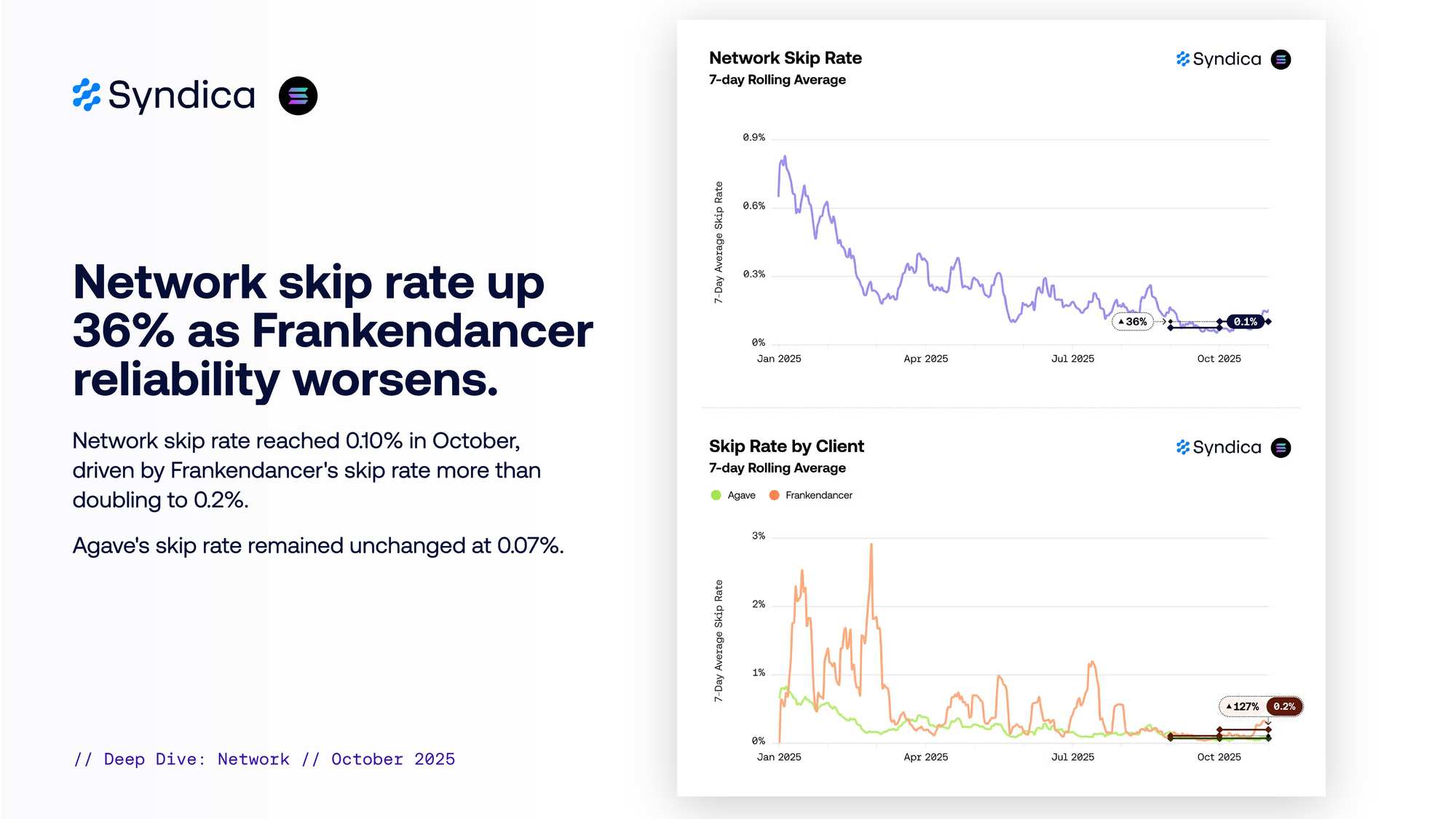 随着 Frankendancer 可靠性恶化,网络跳过率上升 36%。10 月份网络跳过率达到 0.10%,原因是 Frankendancer 的跳过率增加了一倍多,达到 0.2%。Agave 的跳过率保持不变,为 0.07%。
