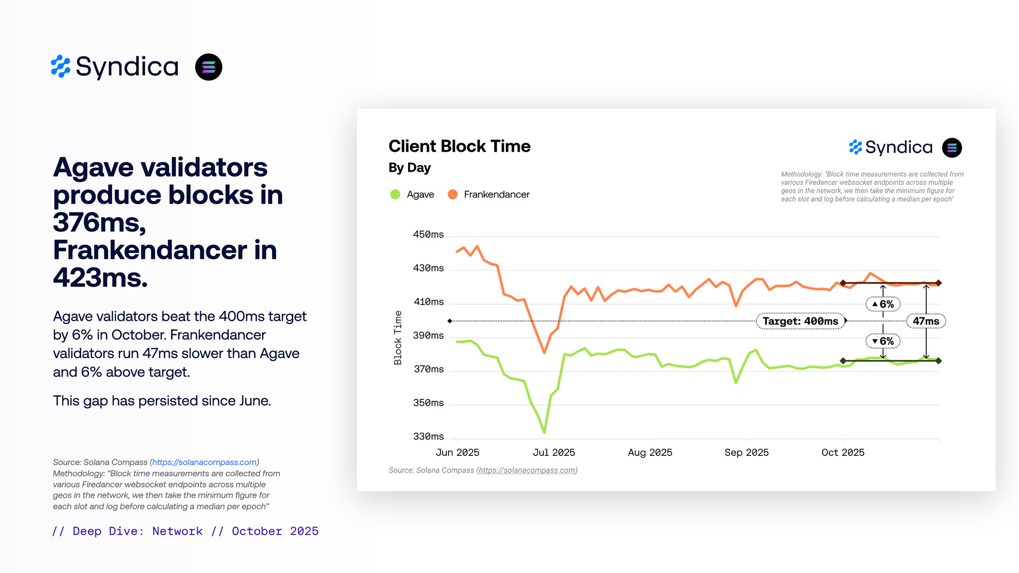 Agave 验证器在 376 毫秒内生成区块,Frankendancer 在 423 毫秒内生成区块。Agave 验证器在 10 月份超过了 400 毫秒的目标 6%。Frankendancer 验证器的运行速度比 Agave 慢 47 毫秒,比目标高 6%。自 6 月以来,这种差距一直存在。