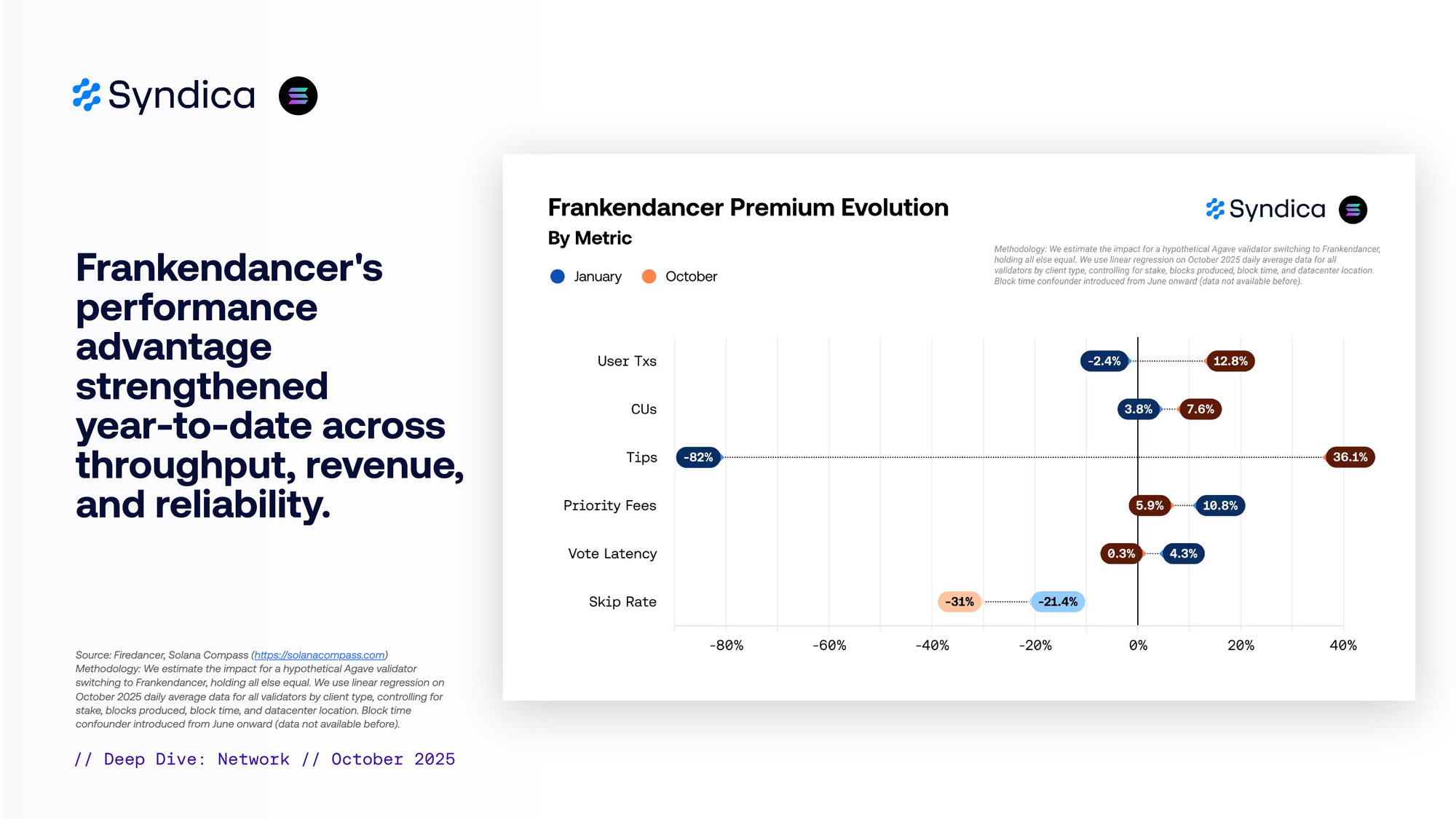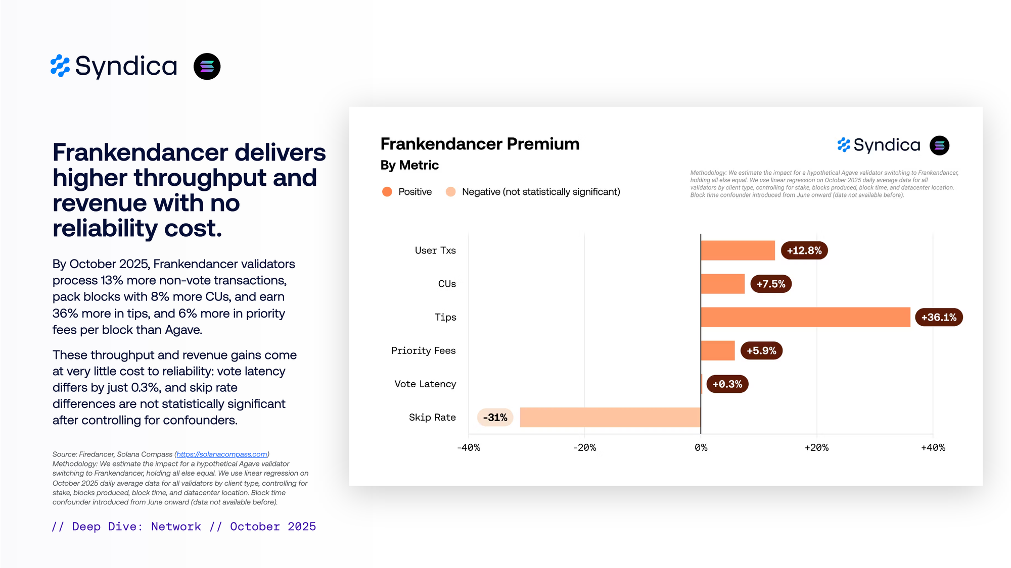Frankendancer 在不牺牲可靠性的前提下,提供了更高的吞吐量和收入。到 2025 年 10 月,Frankendancer 验证器处理的非投票交易多了 13%,区块打包的 CU 多了 8%,并且每个区块获得的小费多了 36%,优先级费用多了 6%(与 Agave 相比)。这些吞吐量和收入的增长几乎没有牺牲可靠性:投票延迟仅相差 0.3%,并且在控制了干扰因素后,跳过率差异在统计上并不显著。