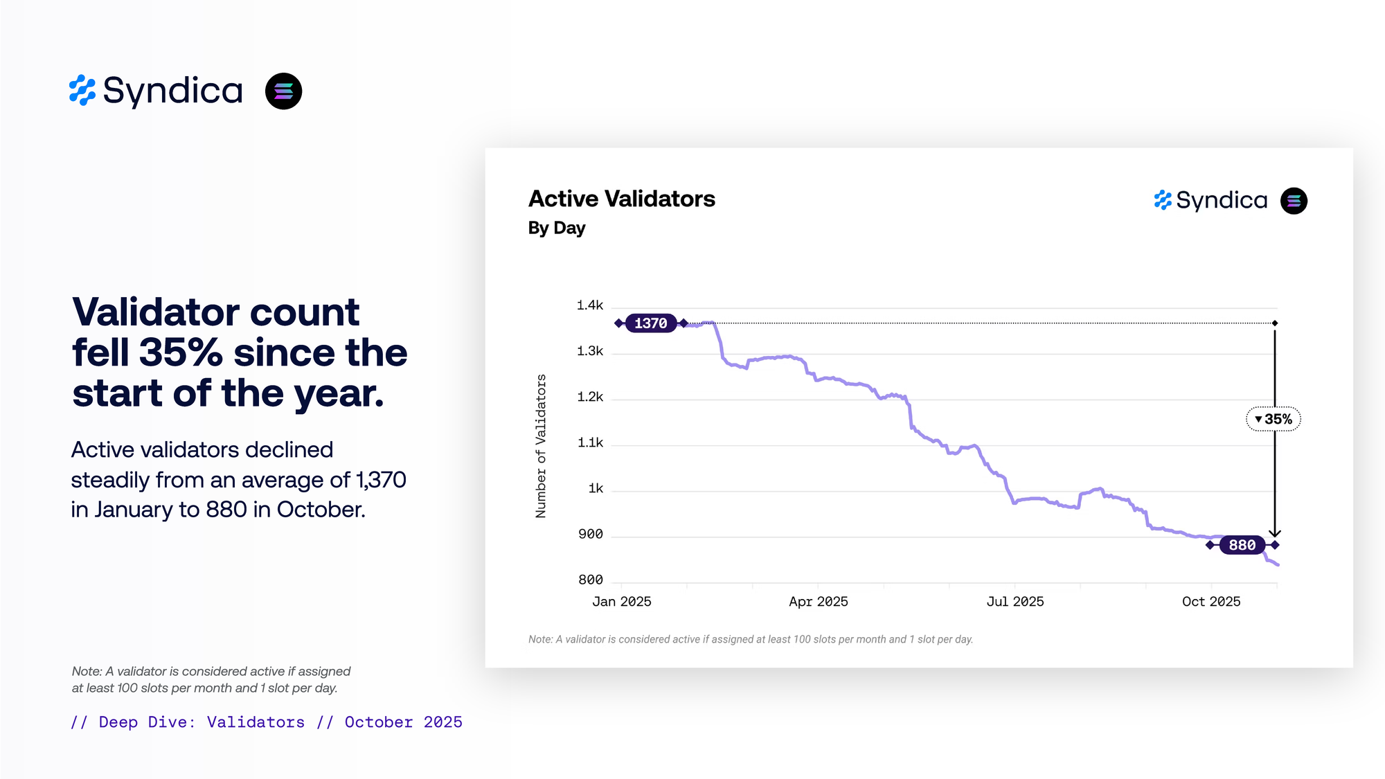自年初以来,验证器数量下降了 35%。活跃验证器从 1 月份的平均 1,370 个稳步下降到 10 月份的 880 个。