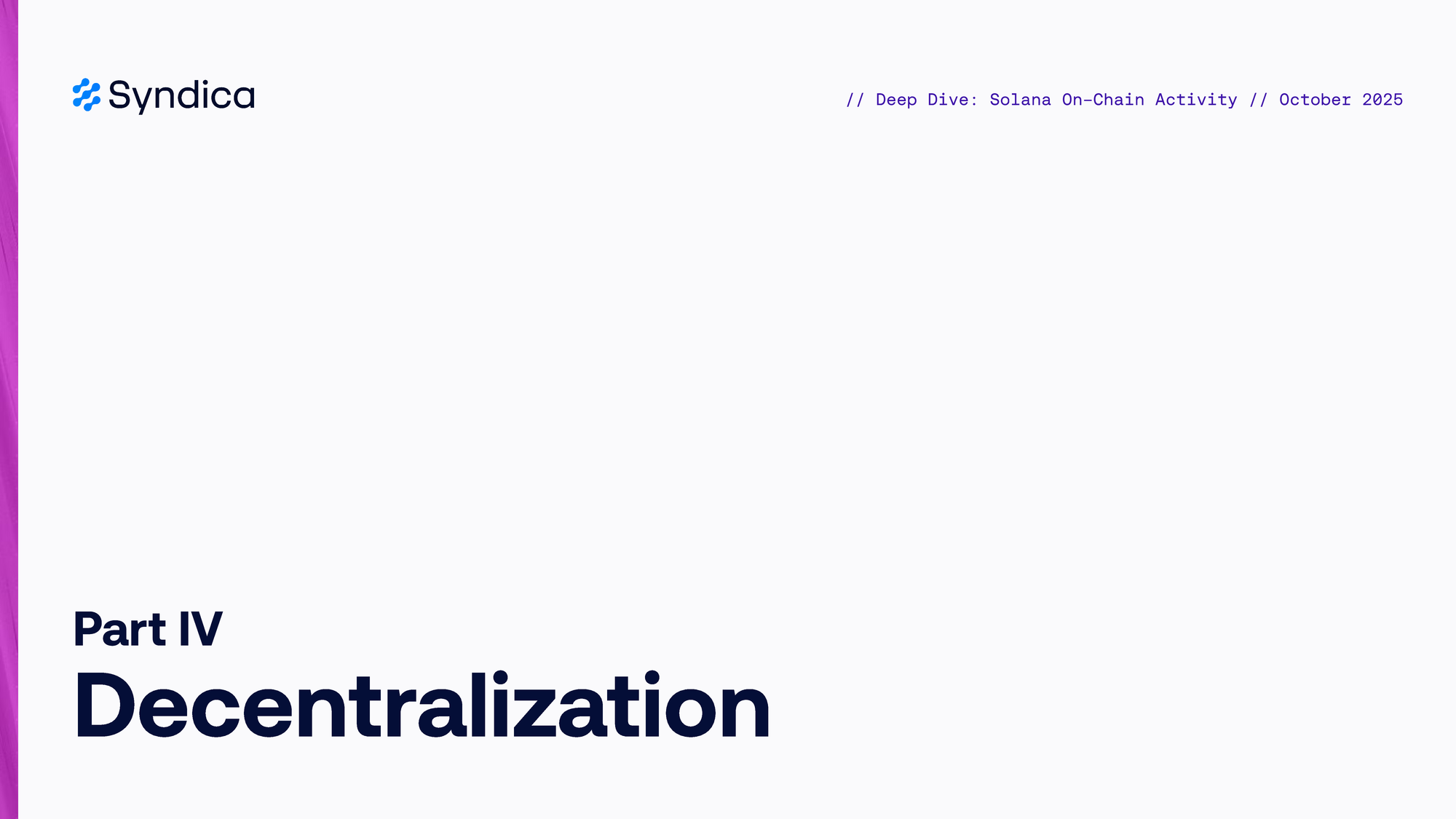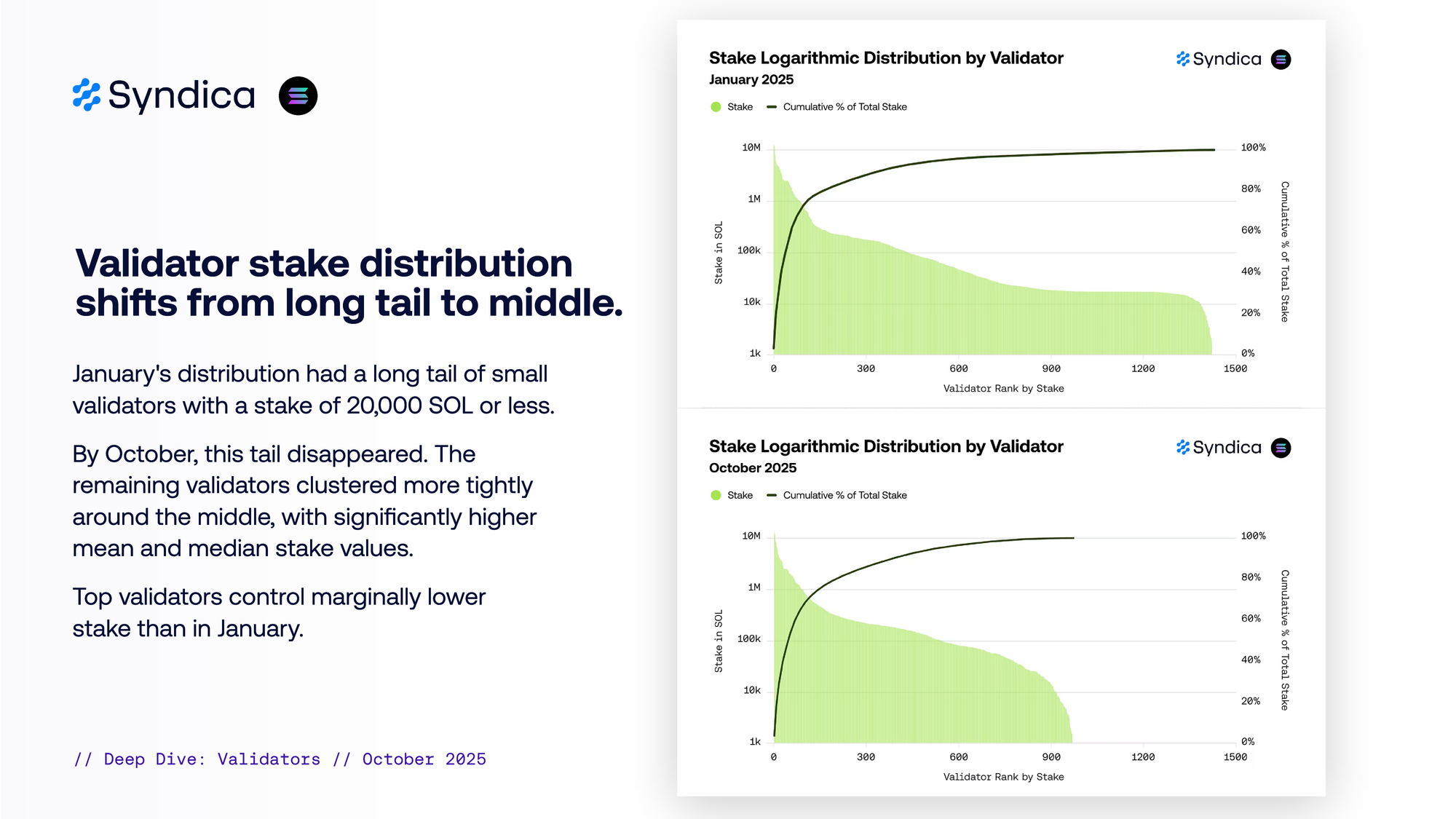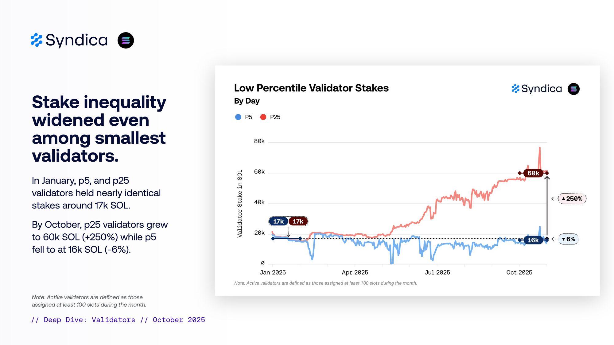 即使在最小的验证器中,stake 不平等现象也加剧了。1 月份,p5 和 p25 验证器持有几乎相同的 stake,约为 1.7 万 SOL。到 10 月份,p25 验证器增长到 6 万 SOL(+250%),而 p5 验证器下降到 1.6 万 SOL(-6%)。