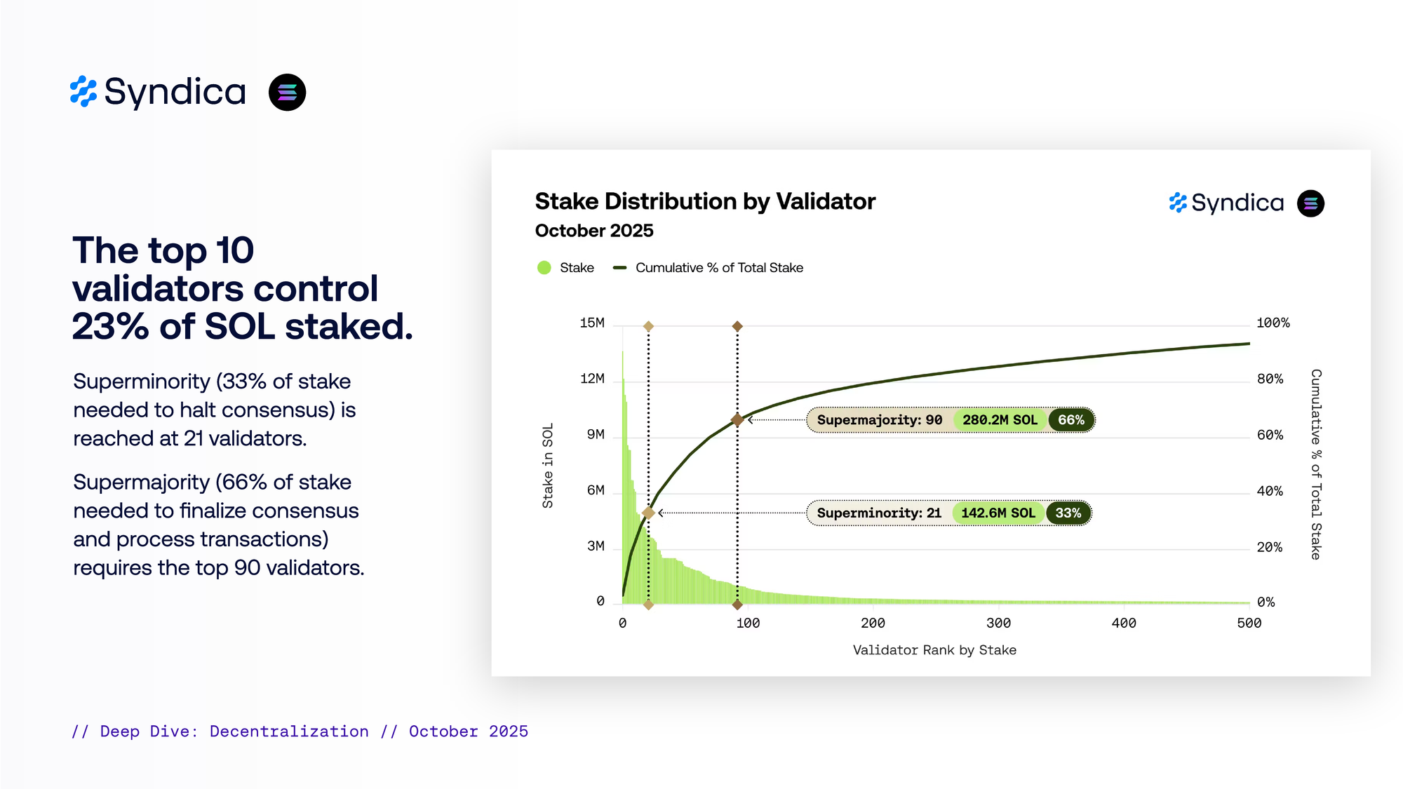 排名前 10 的验证器控制了 23% 的 SOL stake。超级少数(停止共识所需的 33% 的 stake)在 21 个验证器处达到。超级多数(最终确定共识和处理交易所需的 66% 的 stake)需要前 90 个验证器。