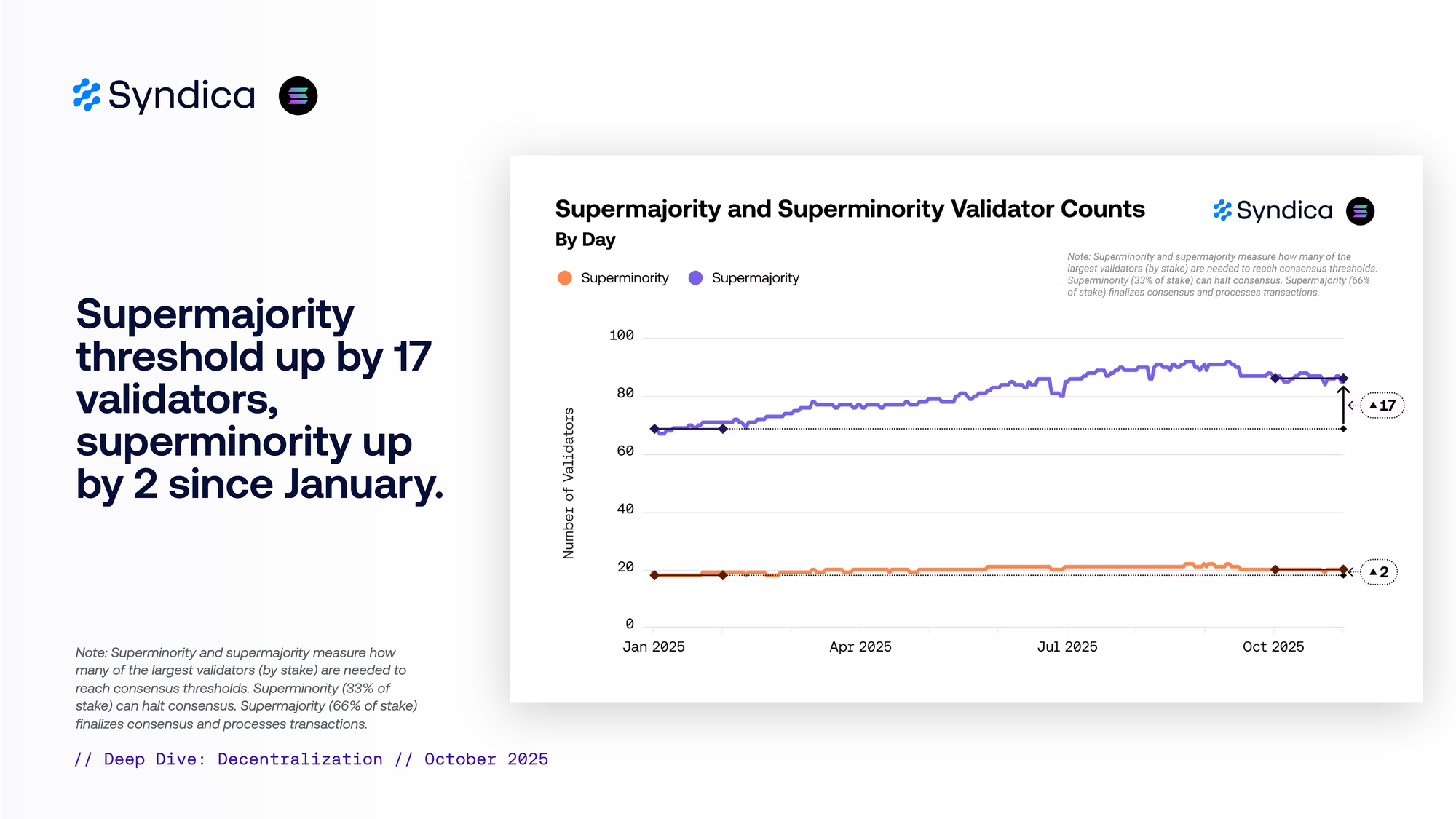自 1 月份以来,超级多数阈值增加了 17 个验证器,超级少数阈值增加了 2 个。