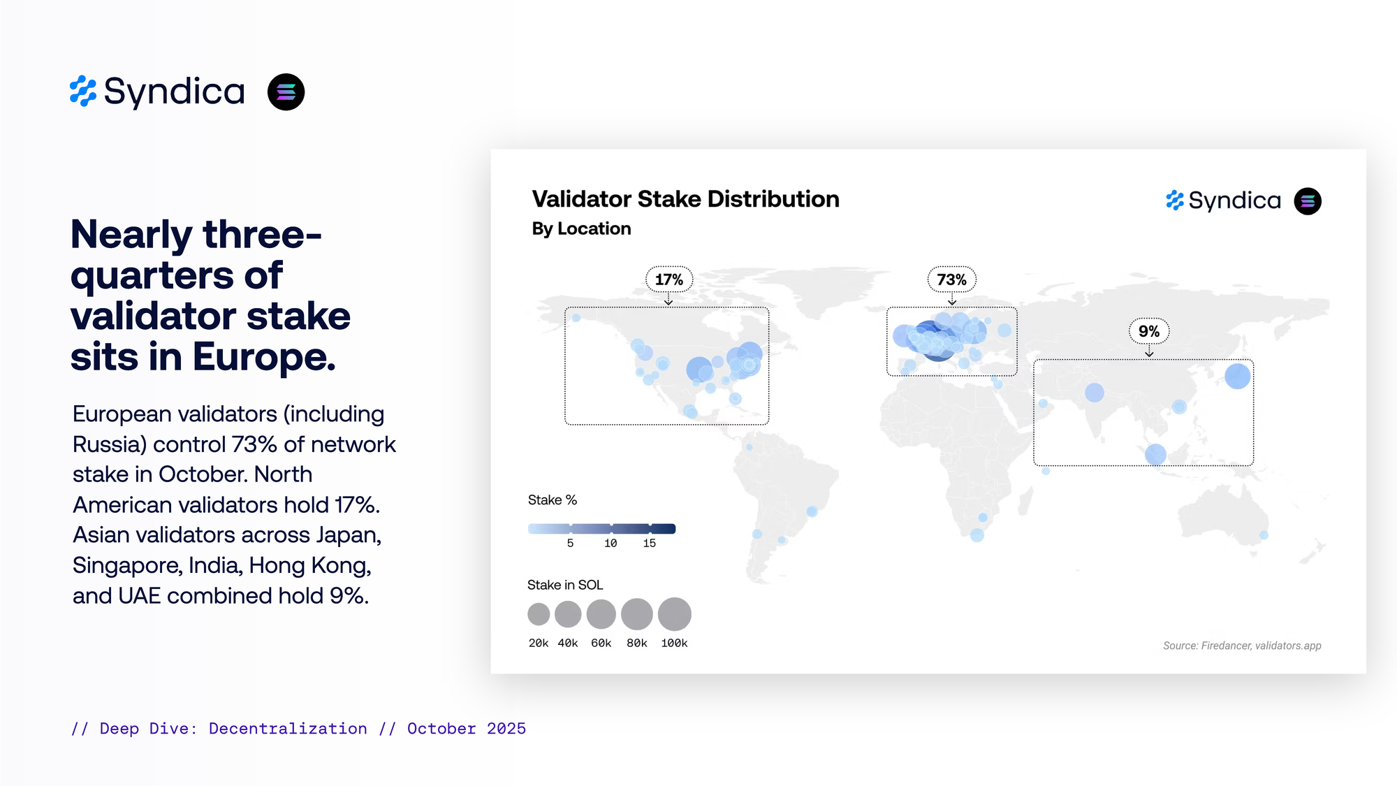 近四分之三的验证器 stake 位于欧洲。10 月份,欧洲验证器(包括俄罗斯)控制着 73% 的网络 stake。北美验证器持有 17%。日本、新加坡、印度、香港和阿联酋的亚洲验证器合计持有 9%。
