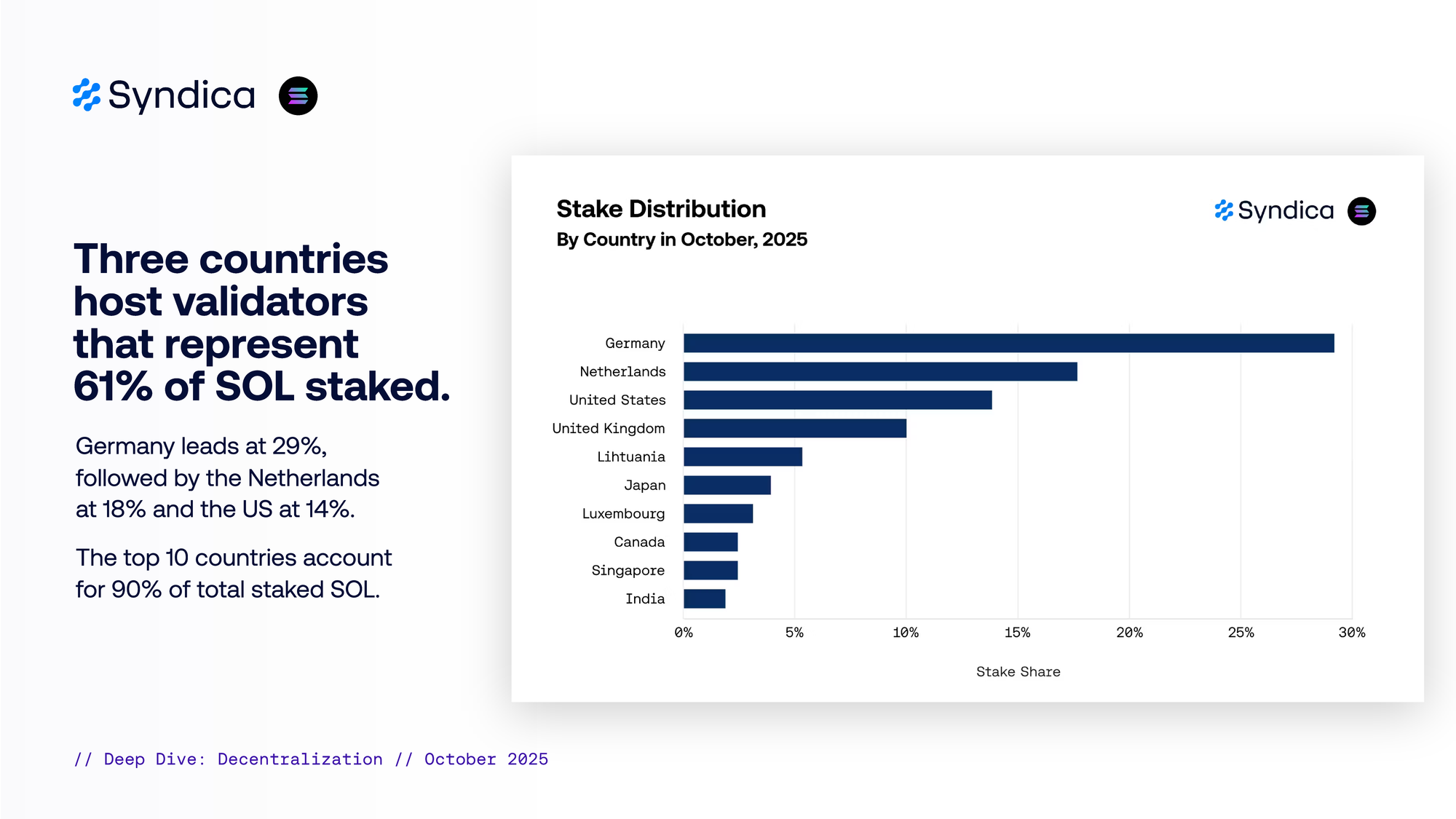 三个国家/地区托管的验证器占 SOL stake 的 61%。德国以 29% 领先,其次是荷兰,占 18%,美国占 14%。前 10 个国家/地区占 SOL 总 stake 的 90%。