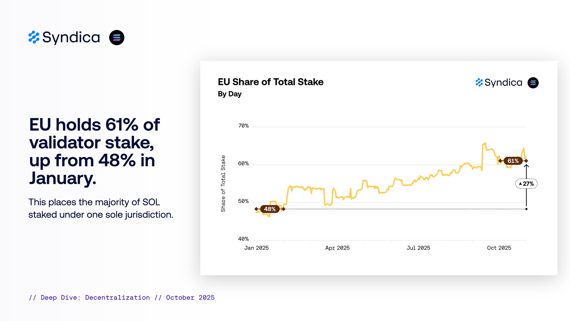 欧盟持有 61% 的验证器 stake,高于 1 月份的 48%。这使得大部分 SOL stake 处于一个唯一的司法管辖区之下。