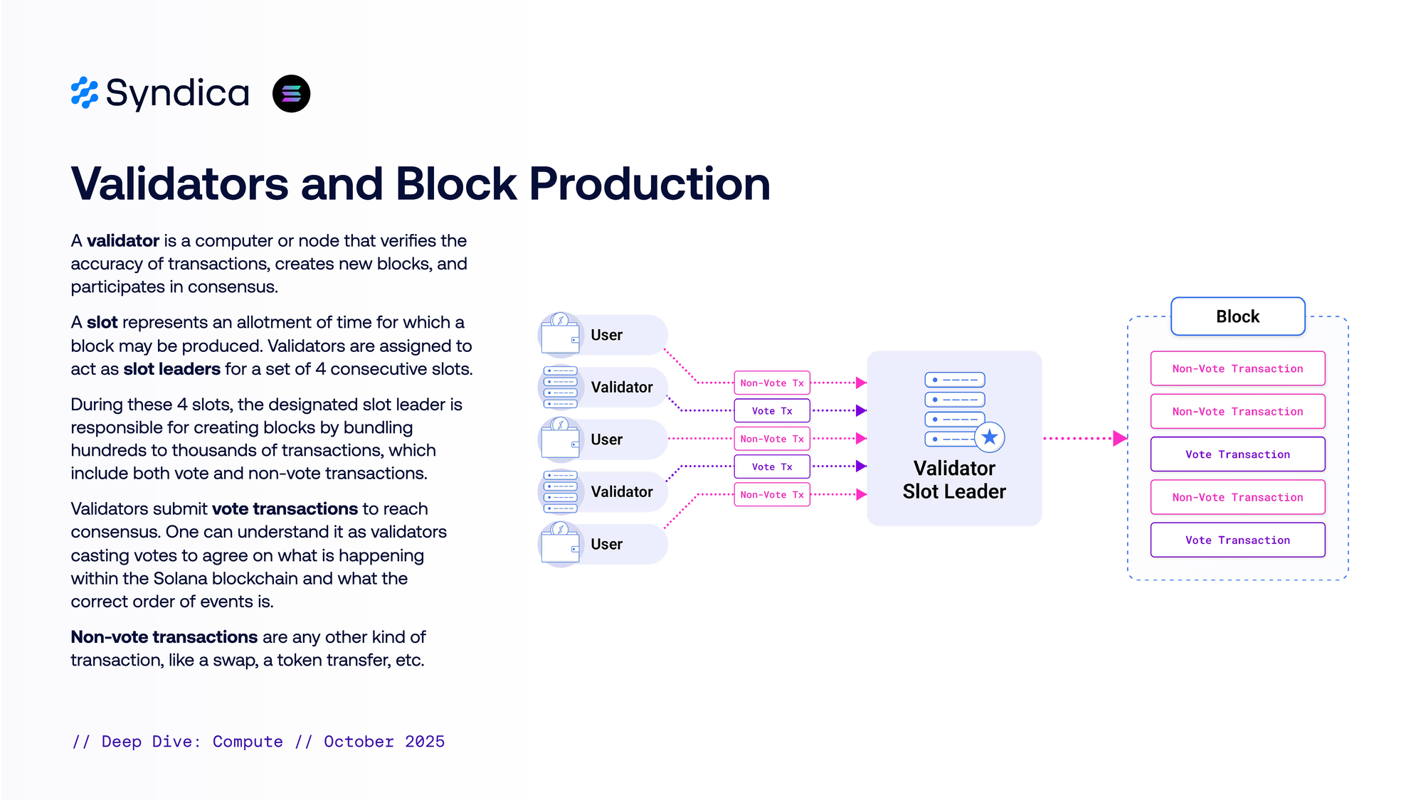 验证器提交投票交易以达成共识。可以将其理解为验证器进行投票,以同意 Solana 区块链中正在发生的事情以及