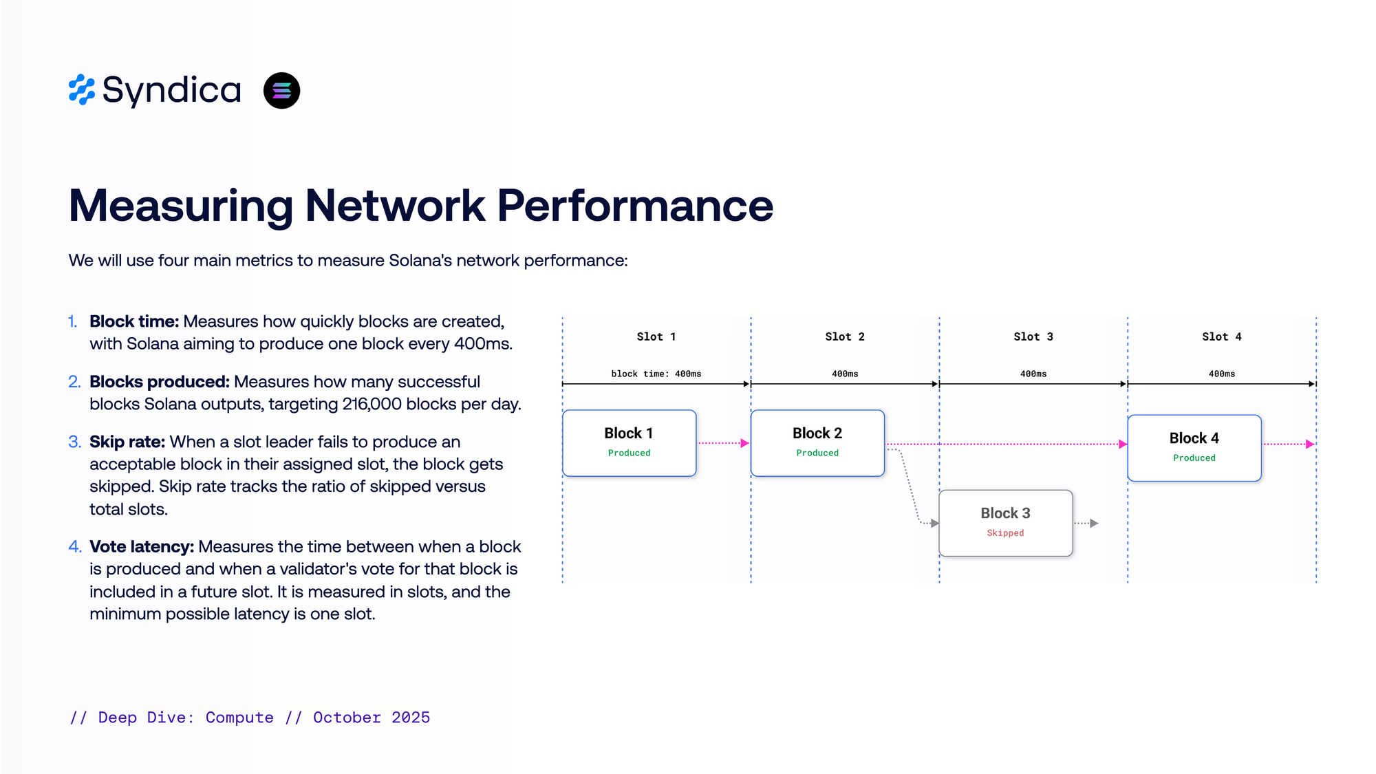 1. 区块时间: 衡量创建区块的速度,Solana 旨在每 400 毫秒生成一个区块。