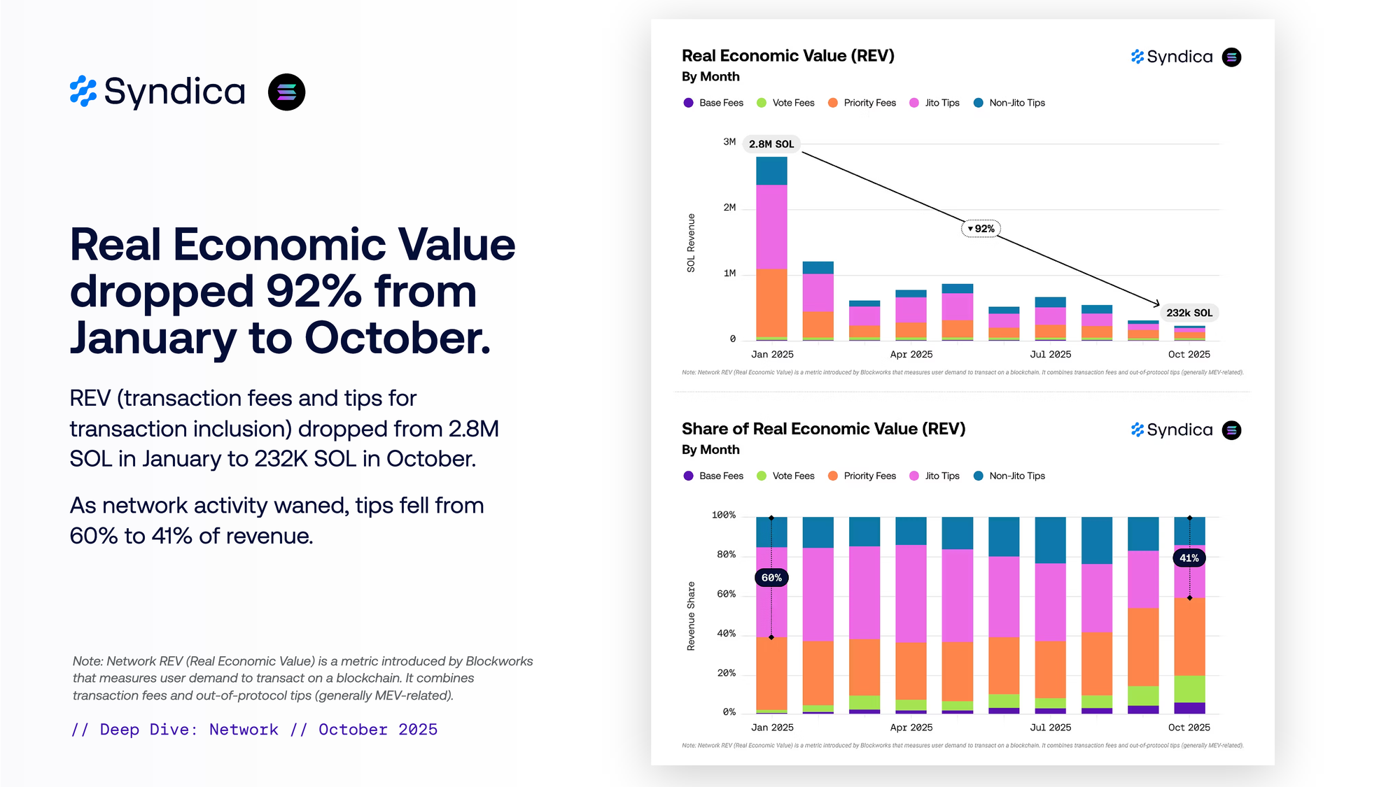 实际经济价值从一月到十月下降了 92%。REV(交易费用和交易包含的小费)从一月份的 280 万 SOL 下降到十月份的 23.2 万 SOL。随着网络活动减弱,小费占收入的比例从 60% 降至 41%。
