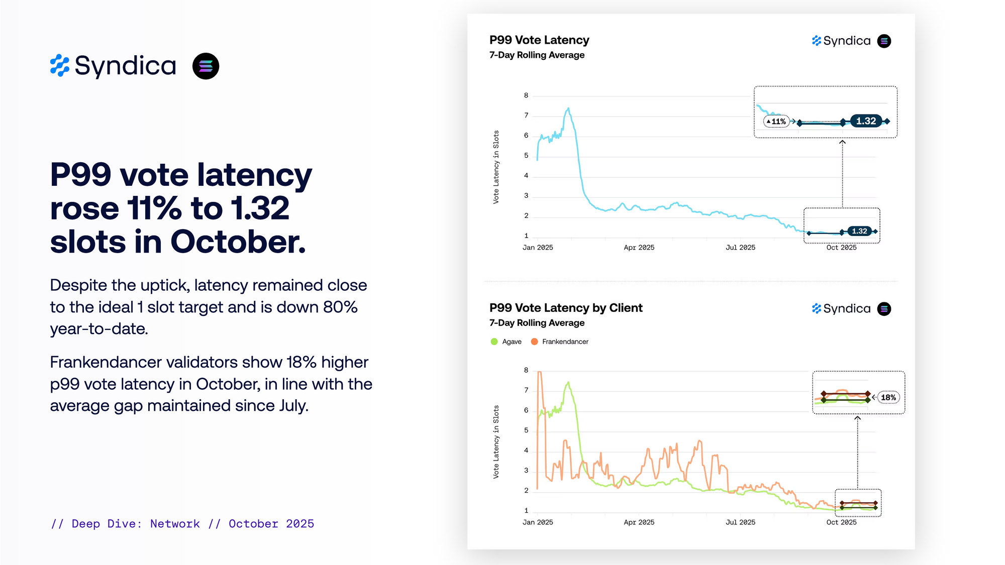 10 月份,P99 投票延迟上升 11% 至 1.32 个Slot。尽管有所上升,但延迟仍接近理想的 1 个Slot目标,并且同比下降了 80%。Frankendancer 验证器在 10 月份显示出高 18% 的 p99 投票延迟,与自 7 月份以来保持的平均差距一致。