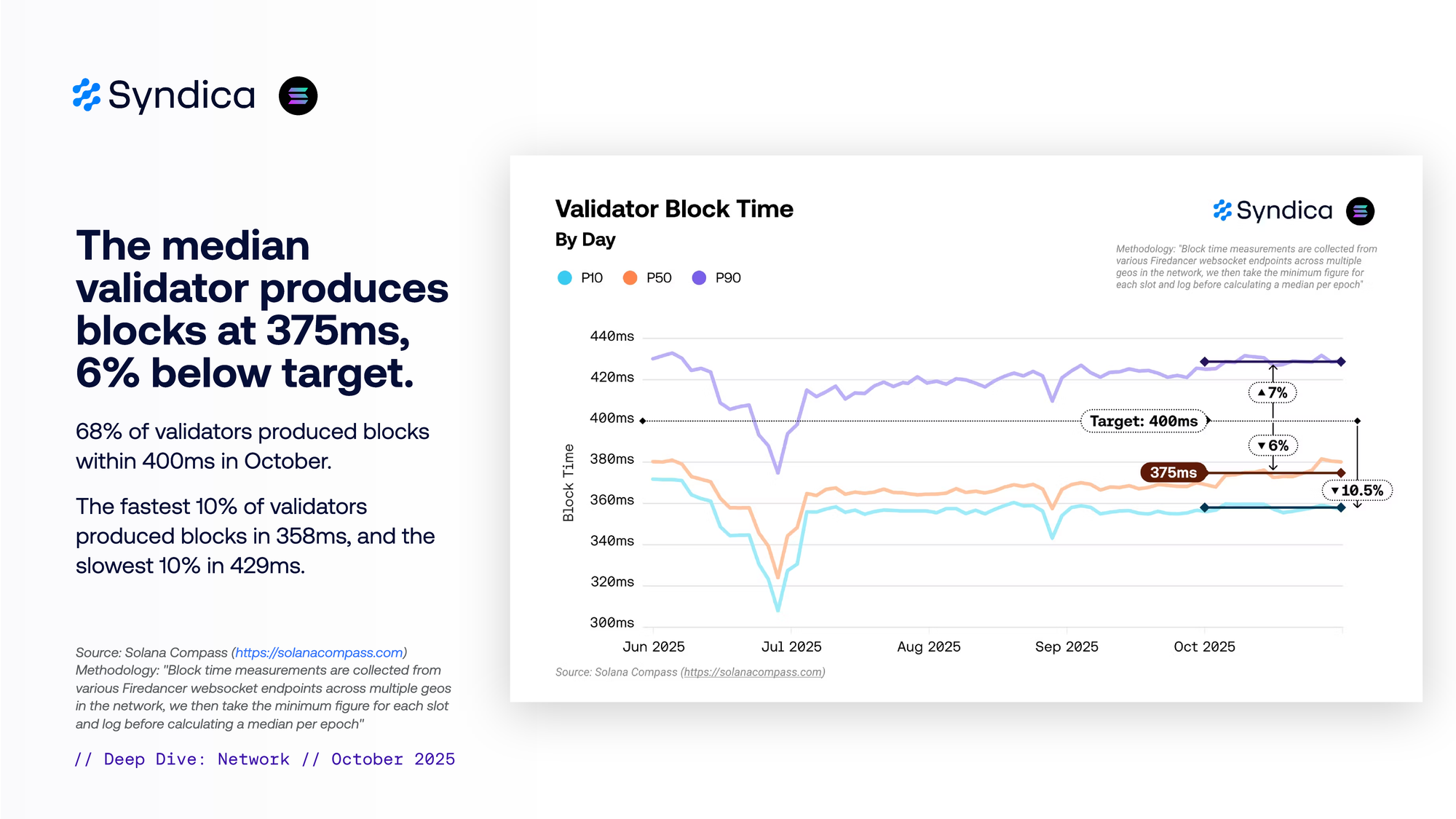 中间验证器在 375 毫秒内生成区块,比目标低 6%。10 月份,68% 的验证器在 400 毫秒内生成区块。速度最快的 10% 的验证器在 358 毫秒内生成区块,速度最慢的 10% 的验证器在 429 毫秒内生成区块。