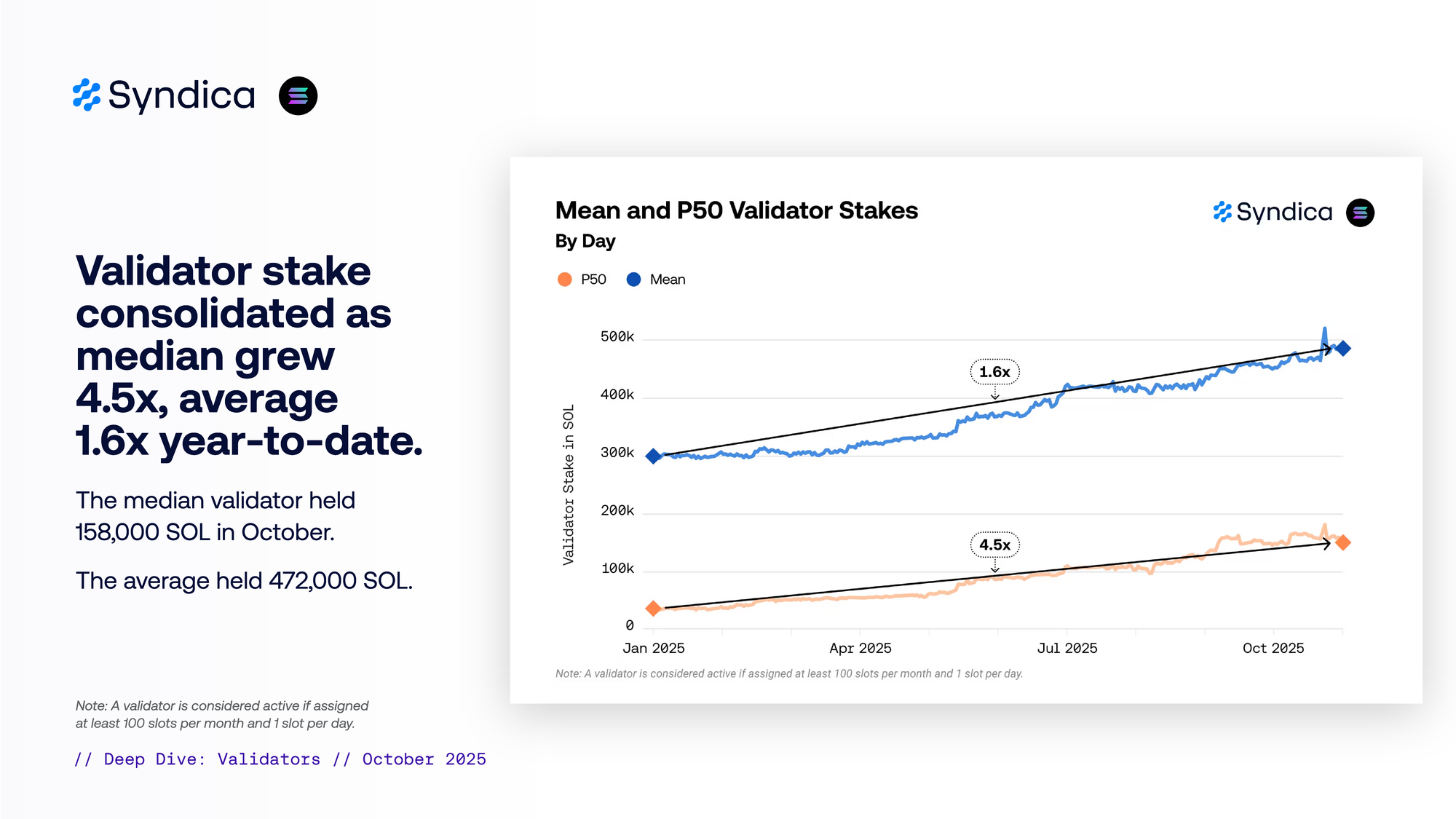 随着中间值增长 4.5 倍,平均值增长 1.6 倍,验证器 stake 得到巩固。中间验证器在 10 月份持有 158,000 SOL。平均持有 472,000 SOL。