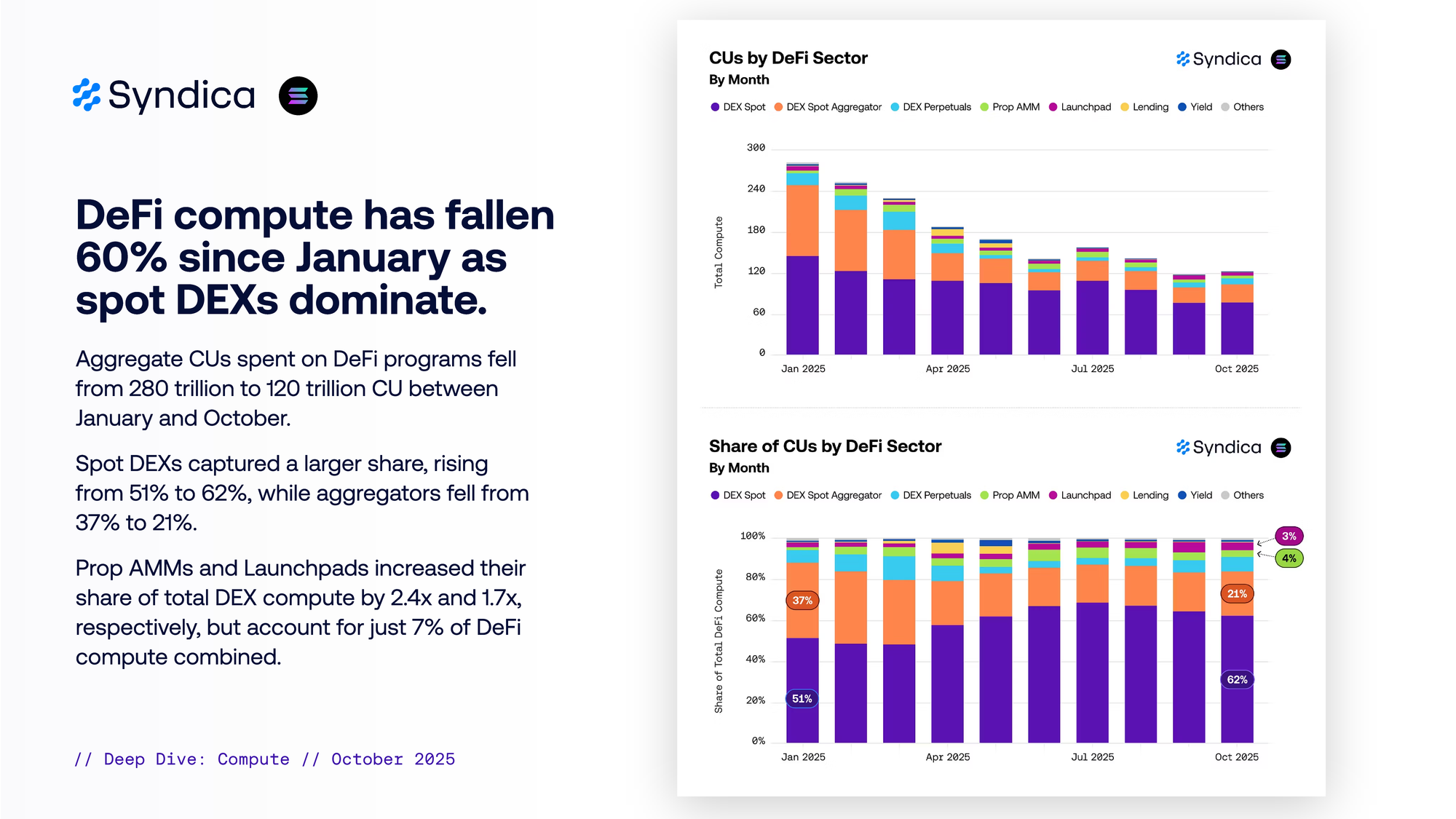 自从现货 DEX 占据主导地位以来,DeFi 计算量已从 1 月份下降了 60%。1 月至 10 月期间,用于 DeFi 程序的聚合 CU 从 280 万亿下降到 120 万亿 CU。现货 DEX 占据了更大的份额,从 51% 上升到 62%,而聚合器从 37% 下降到 21%。Prop AMM 和 Launchpad 在 DEX 总计算量中所占的份额分别增加了 2.4 倍和 1.7 倍,但合计仅占 DeFi 计算量的 7%。