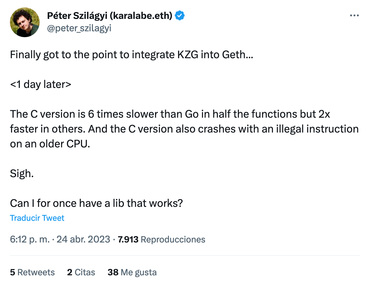 前几天,以太坊的团队负责人 Péter Szilágyi 说,C 版本的 KZG 库在某些系统上崩溃了: