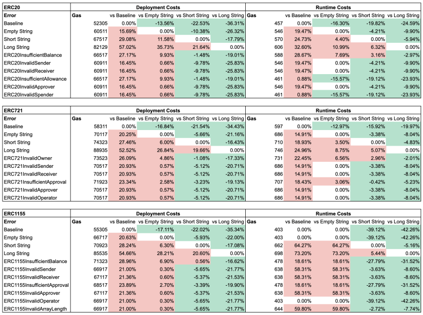 正如 Solidity v0.8.4 版本发布说明中所述,使用自定义错误可以降低运行时和部署成本。你可以在这里查看示例基准,比较了按照标准使用自定义错误抛出错误与使用传统回滚字符串的成本。gas 节省来自于回滚字符串存储在部署字节码中,而对于自定义错误,只存储错误的 4 字节选择器。