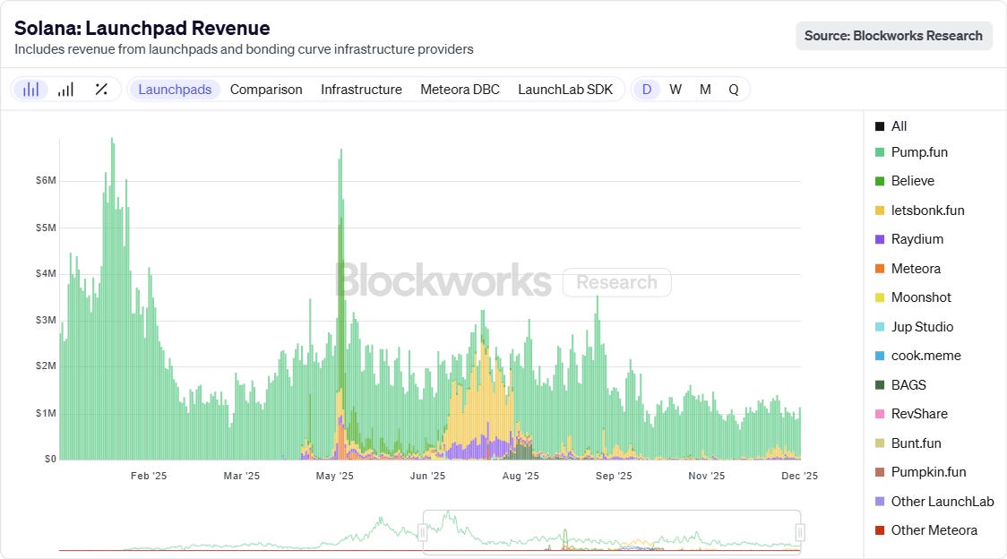 memecoin 的繁荣将部署基础设施变成了一项高利润的业务。2025 年的 Launchpad 时代通过提供 bonding curve(一种自动执行代币价格和流动性注入的数学模型)基础设施,彻底改变了代币的创建和交易。它允许任何人以几美元的价格部署一种代币,平台负责处理过渡到 DEX(如 Raydium),一旦筹集到足够的资金。