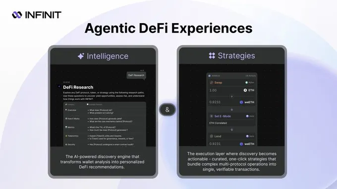 想象一下,如果一个代理可以分析用户的投资组合、投资目标和风险状况——然后集成链上和链下数据,为每个人推荐和执行定制的 DeFi 策略。如果这成为可能,更多的资金将流入 DeFi,整个加密货币经济将享有更大的流动性。INFINIT 正在通过各种产品朝着这个目标努力,这些产品将在下面介绍。