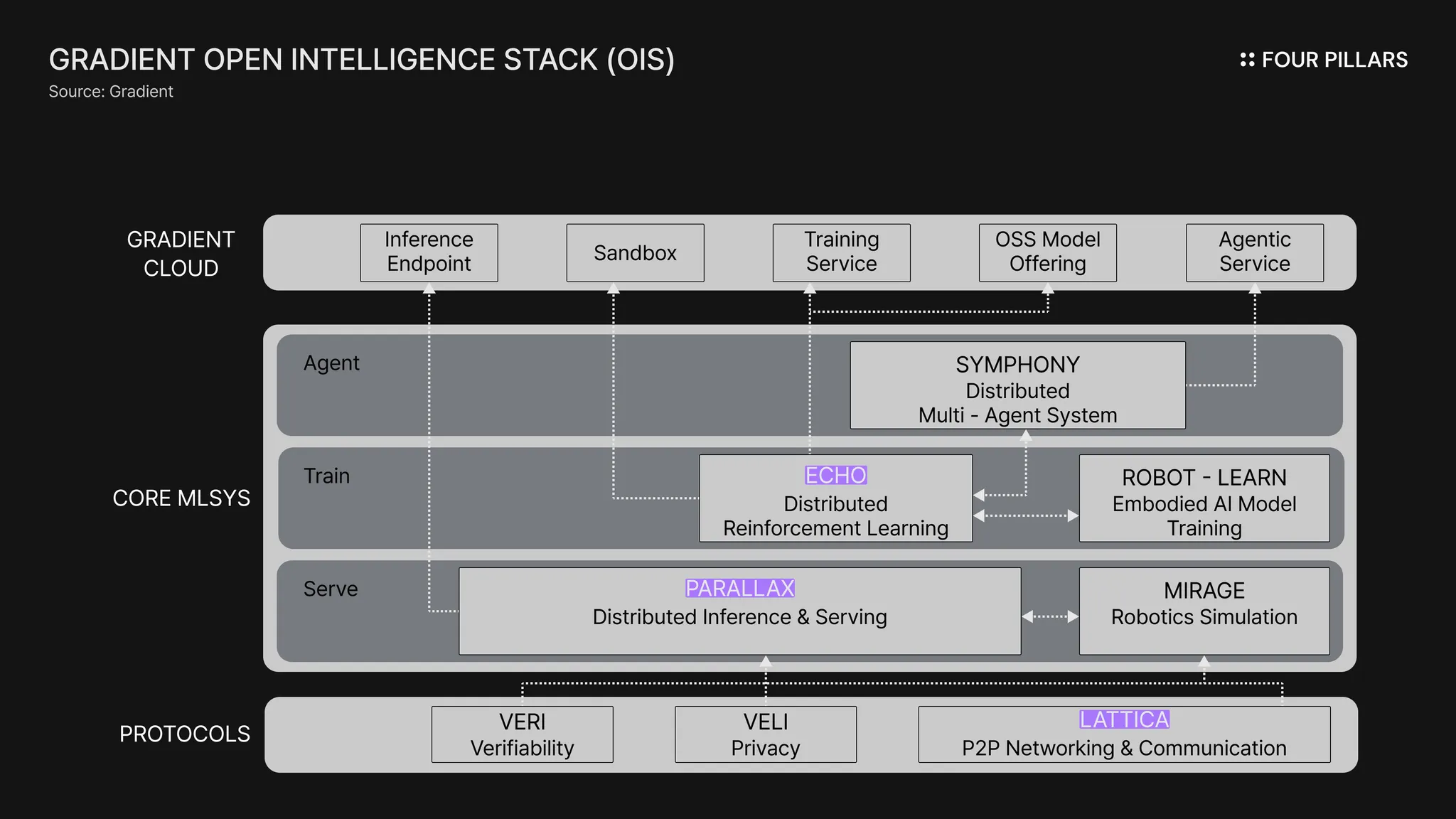 • Gradient 正在重新设计人工智能推理和训练所需的每个组件——数据、计算和通信——作为去中心化层,并将它们集成到一个统一的堆栈中。通过这种方式,该团队正在构建一个可扩展的、开放的人工智能智能全栈,任何人都可以参与、验证和协作运营。