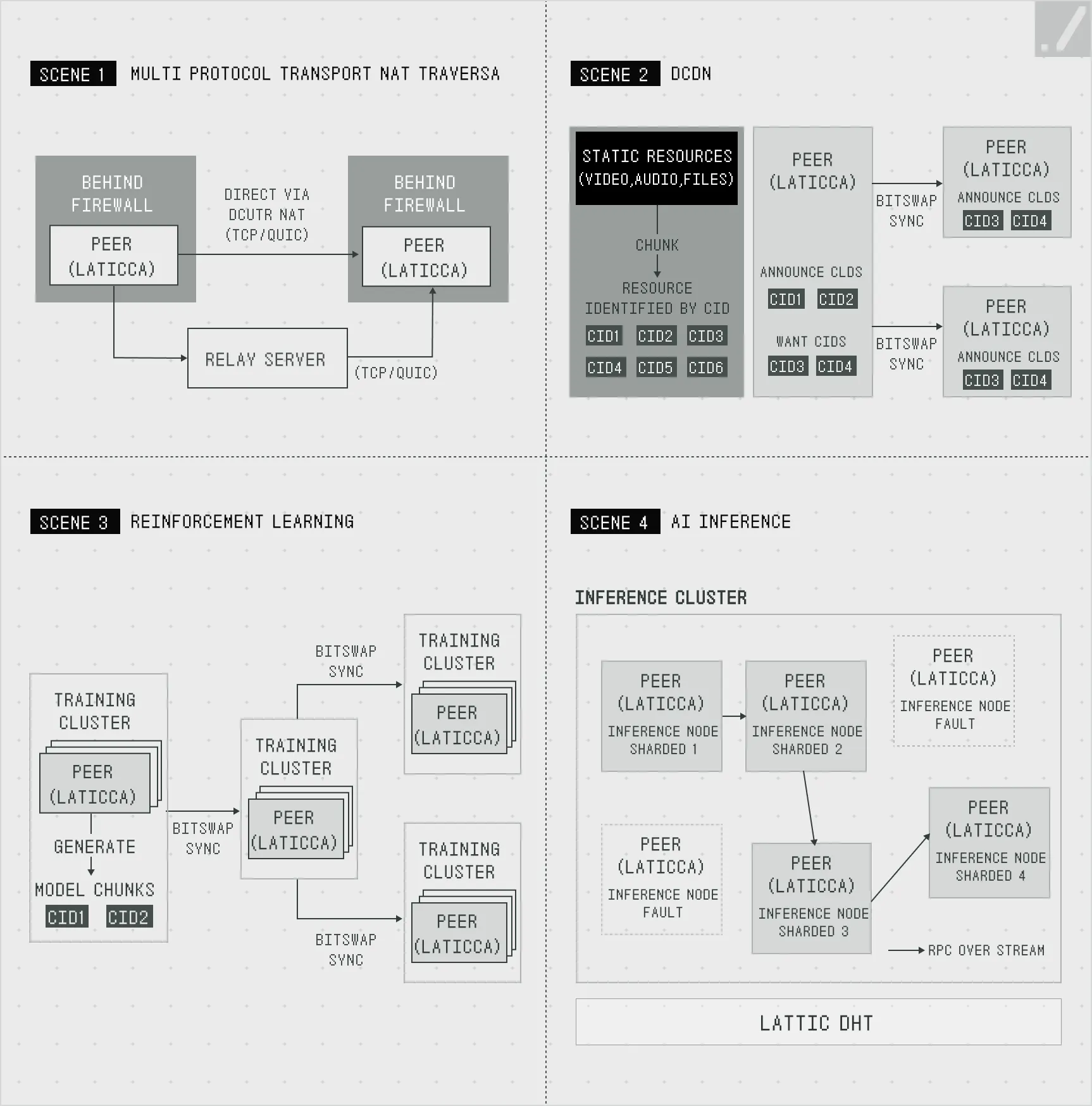 Lattica 将多个层——包括通信层、协议功能层和应用层——集成和抽象为一个统一的堆栈。它结合了 NAT 穿越 *、分布式哈希表 (DHT) **、分布式内容分发网络 (DCDN) 和基于 libp2p 流的 RPC 框架,从而确保了数据中心、GPU、浏览器节点和边缘设备之间的平滑、灵活的连接。