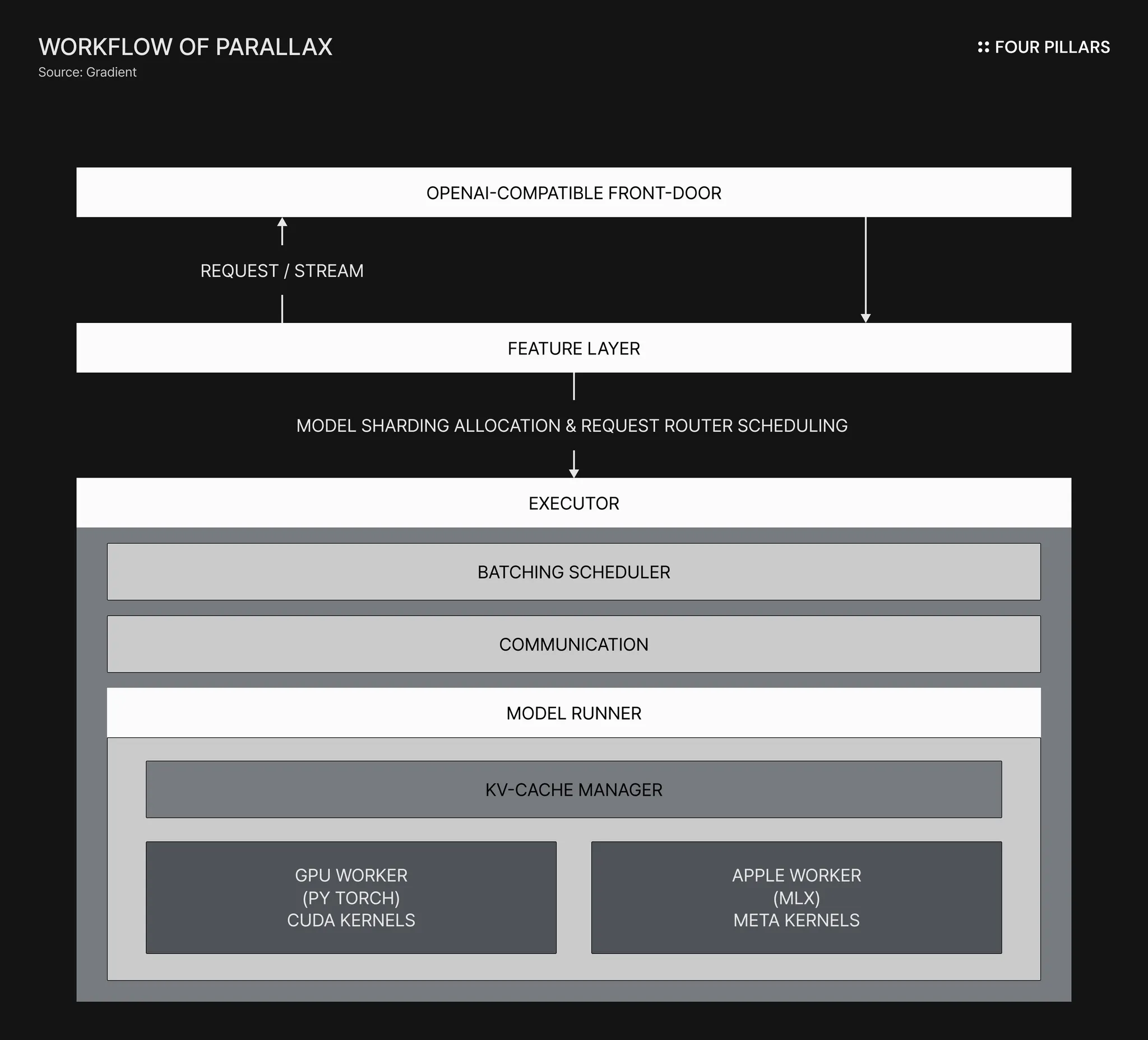 如果说 Lattica 充当网络层,统一不同的通信环境并实现节点之间的 P2P 连接,那么 Parallax 则充当构建在其之上的推理层。利用 Lattica,Parallax 允许用户组装完全自主、定制的集群,通过这些集群,可以高效、可靠地执行任何规模的人工智能模型训练和推理。