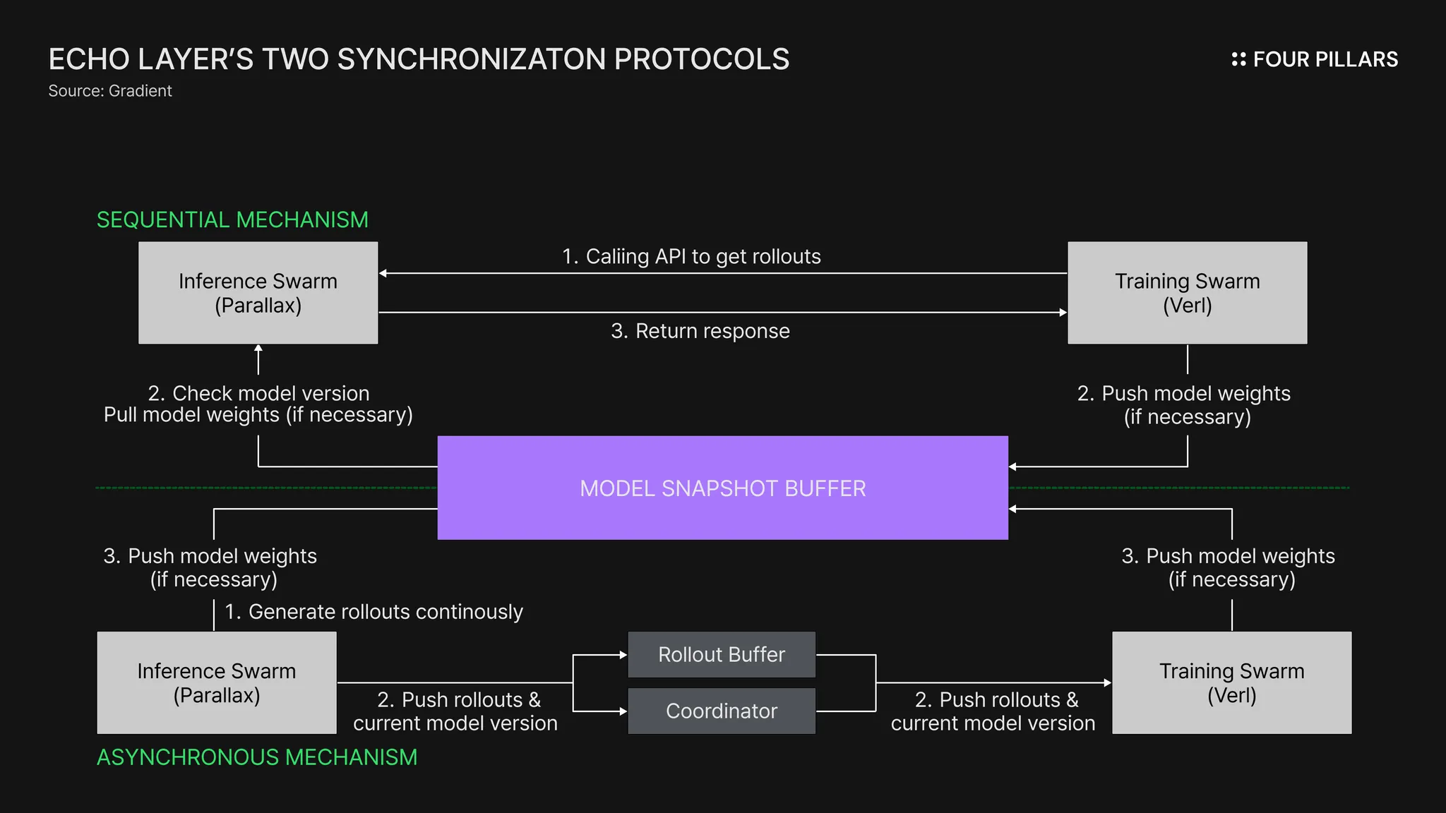 Gradient 的 Echo 是一个经过优化的层,可以将此架构扩展到世界各地的闲置设备。它旨在增强训练和推理动态,以便代理可以更有效地建模。Echo 将训练和推理过程分离到每个群中,从而使每个群都可以根据其指定的角色高效运行。通过同步协议,全球各地的设备相互连接,形成一个稳定且有机运行的庞大的 rollout 工作器网络。