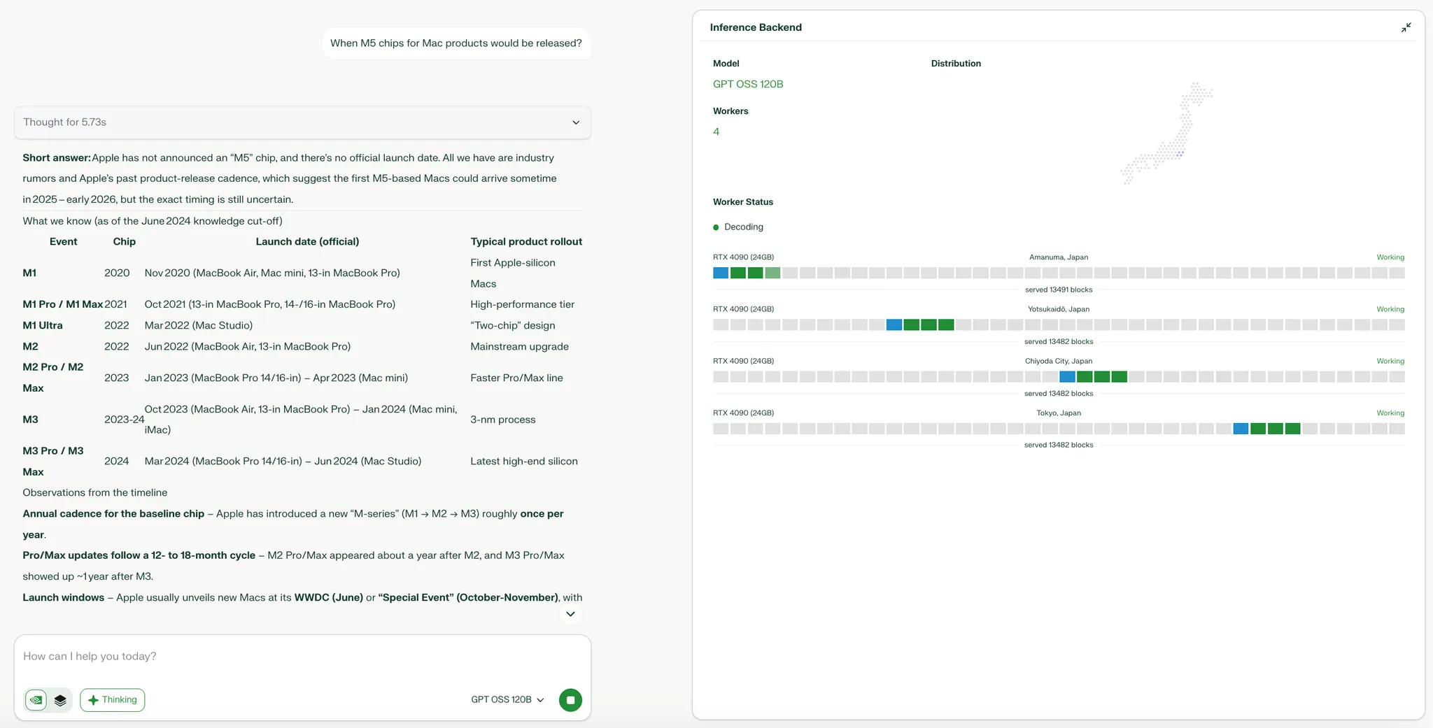 • 基于 Parallax 的分布式网络,由六个节点 (3 × RTX 5090 和 3 × Mac M4 Pro) 组成