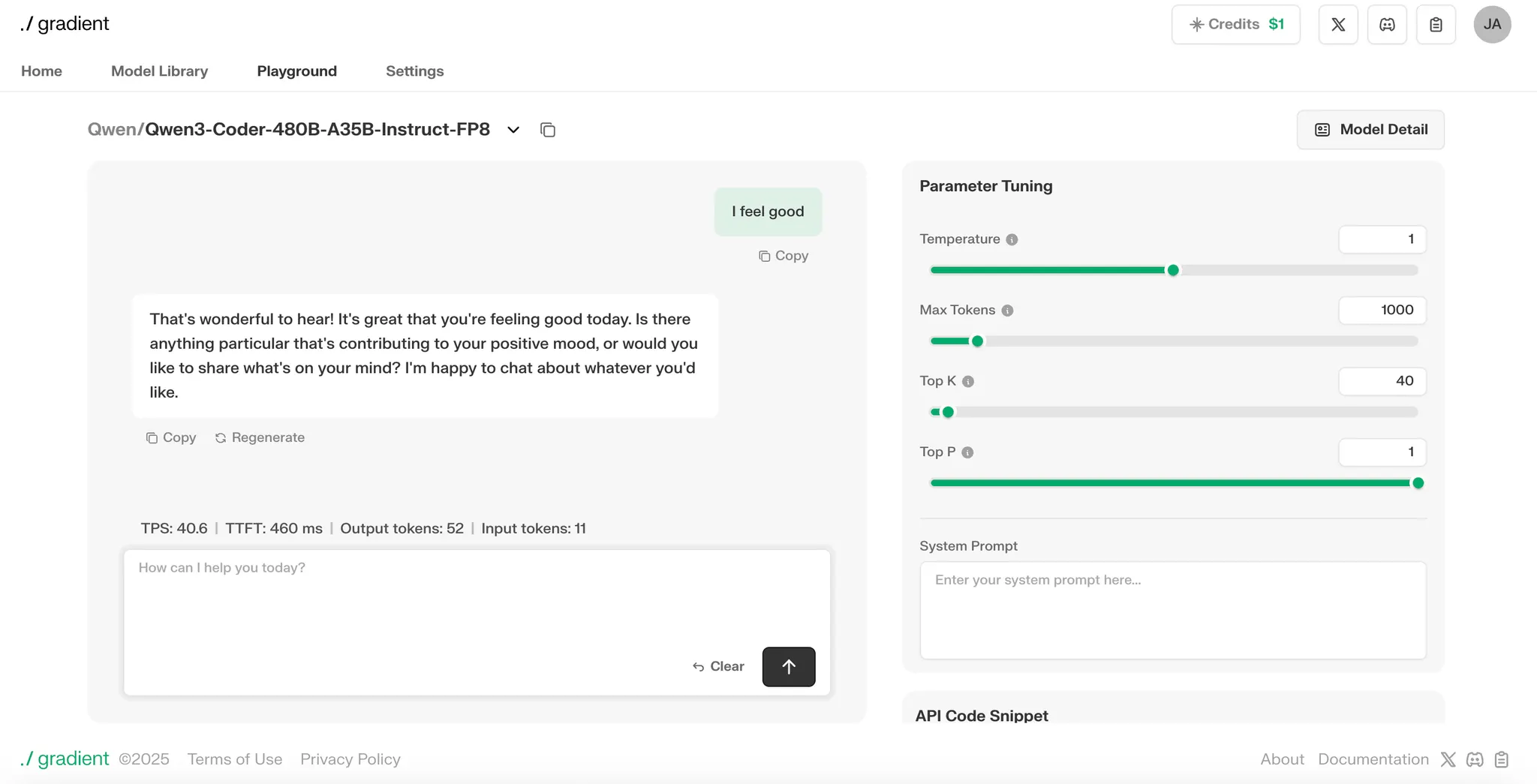 Gradient Cloud 是构建在前面介绍的三个去中心化堆栈——Lattica、Parallax 和 Echo——之上的多合一人力智能开发站。它提供了一个交互式游乐场,用户可以在其中灵活地调整领先的开源模型的推理端点和参数,并通过全球分布式硬件网络一键部署它们。