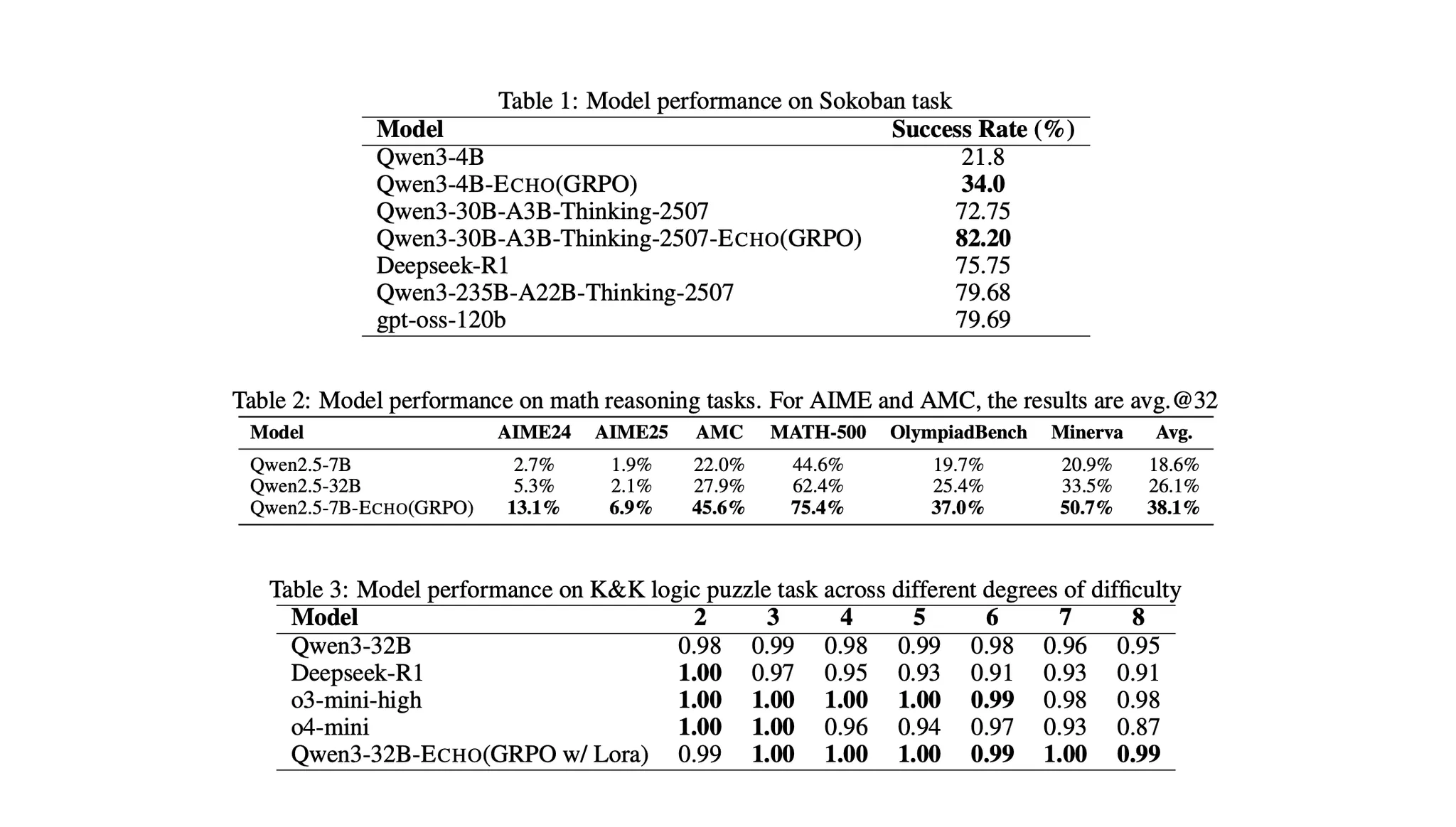 根据 Gradient 的论文,所提出的方法已针对传统的同地协作模型进行了基准测试。评估使用了四个 Qwen 系列基础模型:Qwen3-4B、Qwen2.5-7B、Qwen3-32B 和 Qwen3-30B-A3B-Thinking-2507。