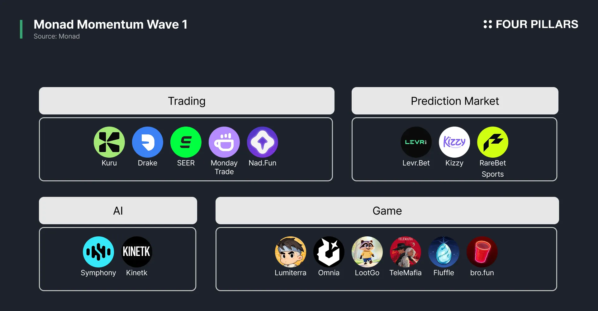 入选 Monad Momentum 第一波的项目也显示出非常多样化的范围,这在一定程度上证实了 Monad 团队旨在构建一个不偏向特定领域的生态系统。
