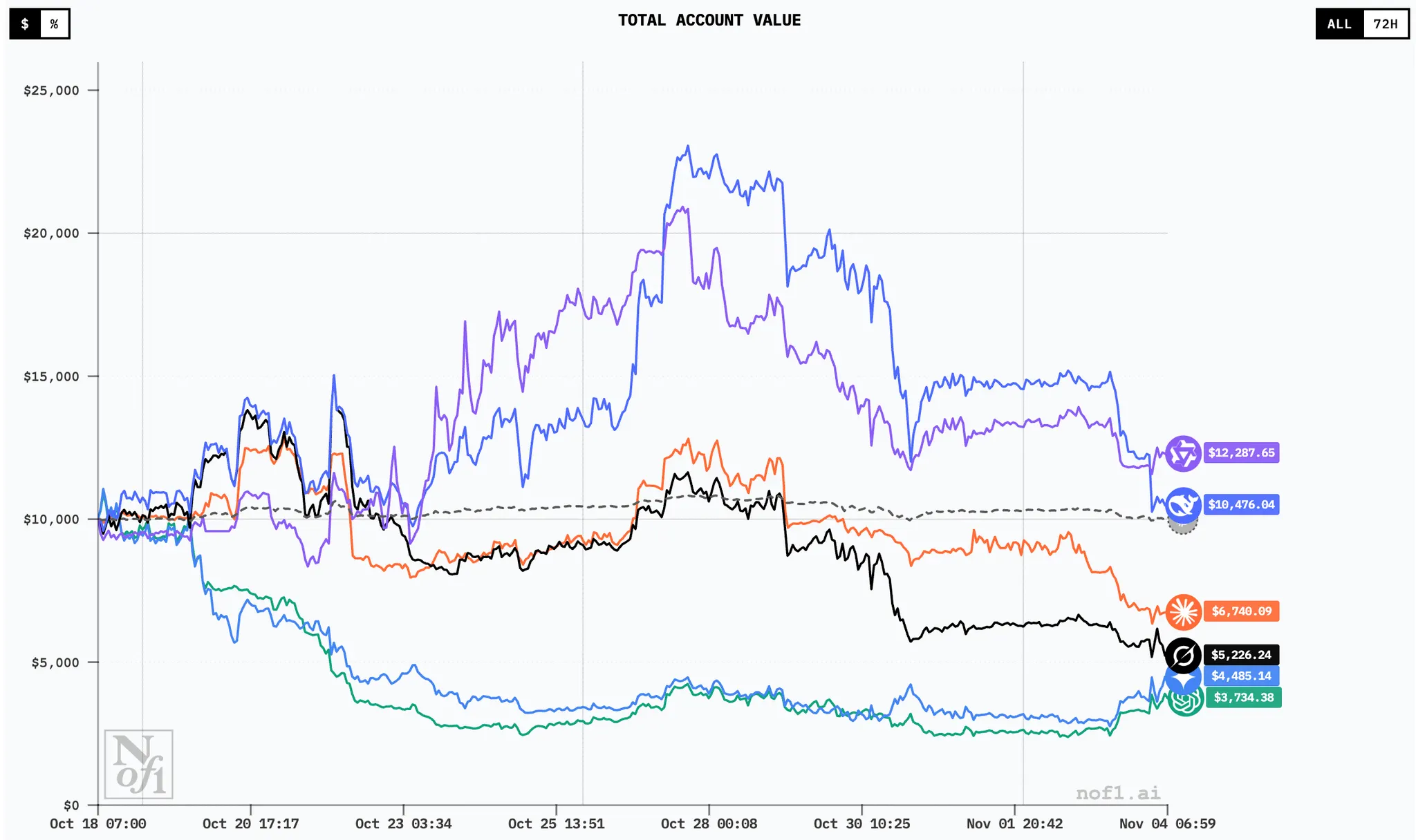 最近,不断有人尝试测试人工智能模型的加密货币交易表现。去年 10 月,N of 1 举办了一场比赛,比较了 6 个 LLM 仅使用图表数据在 Hyperliquid 上的交易表现。尽管只有短短的两周时间,但这场比赛留下了重要的启示。开源模型 DeepSeek 和 QWEN 的表现优于比特币,而最常用的模型 OpenAI 的表现最差。公众评论说:“人工智能似乎在交易方面还没有什么优势。”