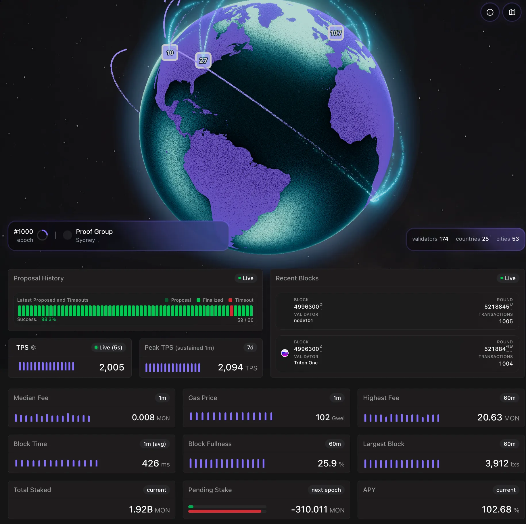 截至 11 月 12 日,随着主网即将启动,Monad 测试网正在实现与 170 多个验证者的实时共识,显示出与 Solana 相当的性能,区块时间为 0.4 秒,最大 4K+ TPS。此外,除基金会运营的节点外,所有验证者的委托金额非常均匀,为 0.5%,并且地理分布与 Solana 相似。