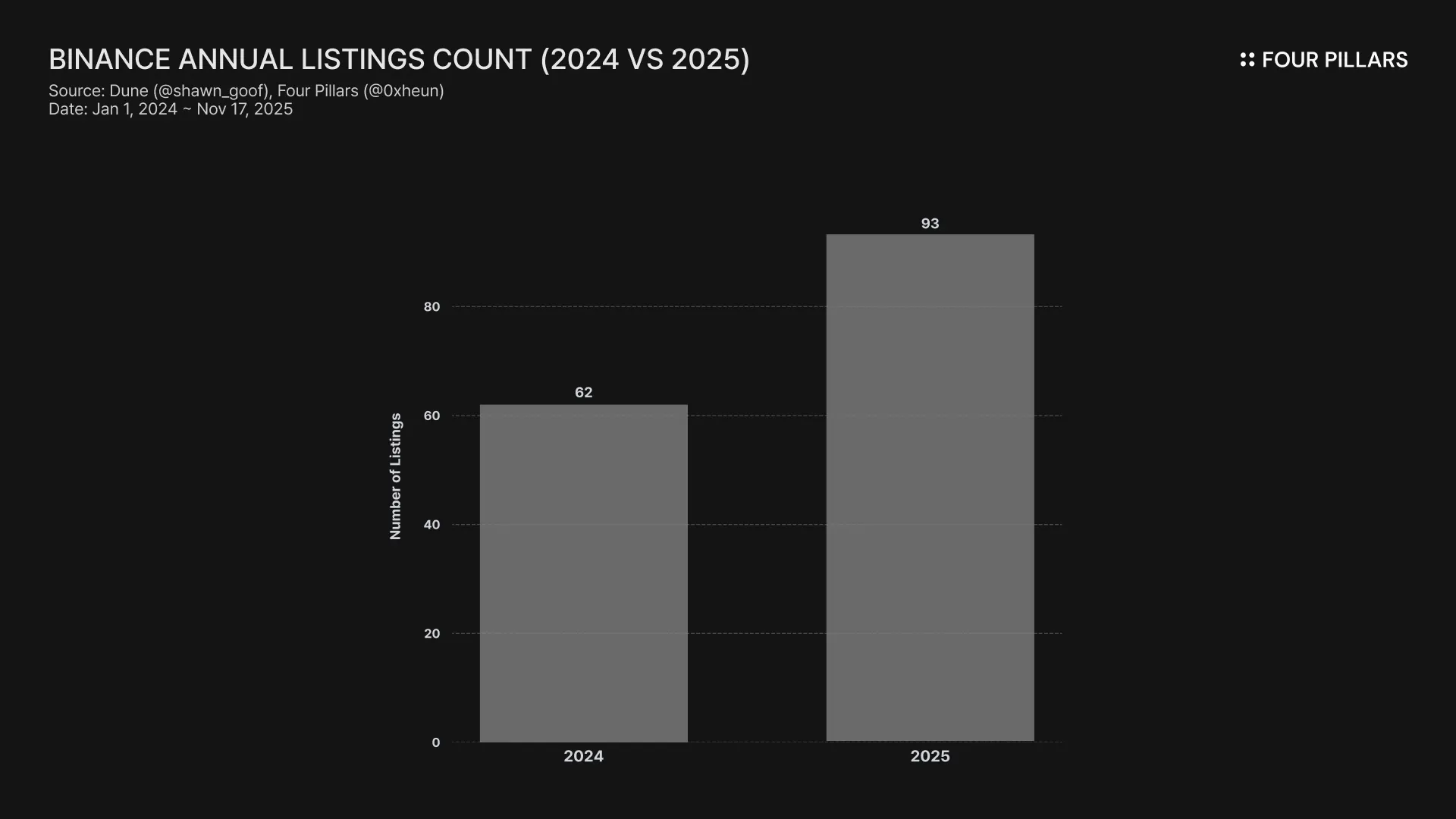 如果说 2024 年是 memecoin 之年,那么 2025 年就是风险投资支持的项目实现上市反弹之年。由于众多概念项目的 TGE 事件,零售商发现很难评估单个项目的价值。事实上,2025 年新代币上市的平均每日数量比上一年增加了 1.5 倍以上(币安:2024 年为 62 个 → 2025 年为 93 个),随着已经上市的代币的涌入,个人几乎不可能跟踪所有项目。