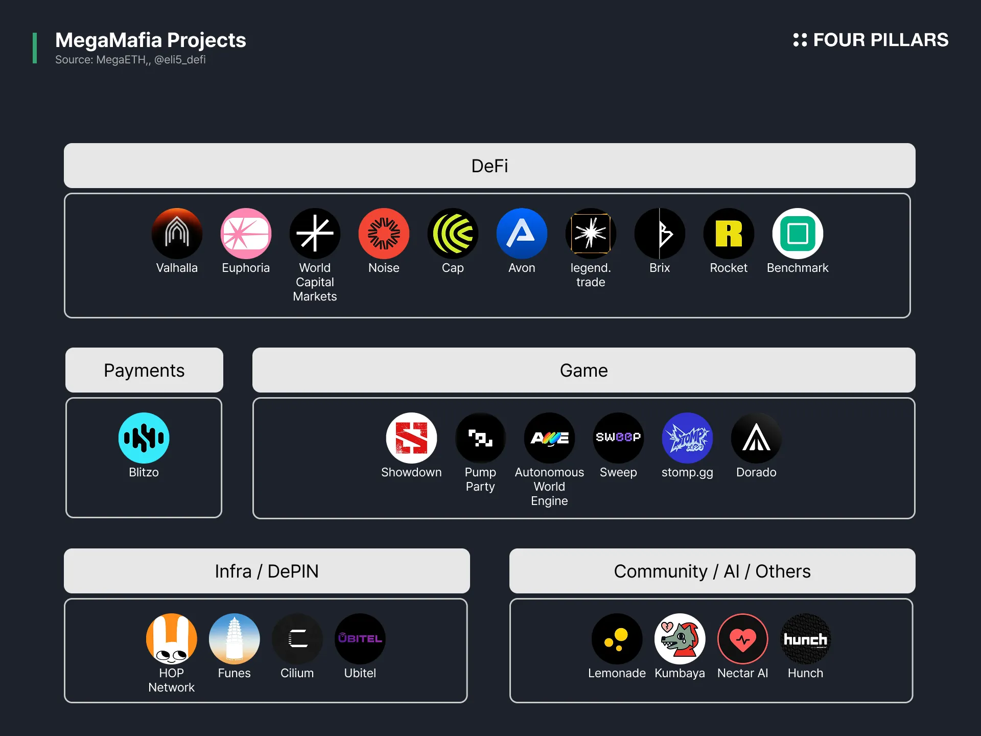 MegaETH 采用了一种方法,即团队通过其自己的加速器计划 MegaMafia 直接选择和培育生态系统项目。目前已确认有 25 个 MegaMafia 项目正在开发中,也针对不同的领域。值得注意的是,仅 MegaMafia 1.0 项目就已经获得了超过 4000 万美元的总融资。考虑到大多数 MegaMafia 项目都独家部署在 MegaMafia 上,因此它们的潜力受到了非常高的评价。然而,许多 MegaMafia 项目,尤其是 MegaMafia 2.0,仅以非常简短的描述引入,例如介绍 1、 介绍 2,服务完全未公开,使得信息过于有限,无法评估项目价值。考虑到它们的开发阶段,预计实际上在 MegaETH 主网启动时部署的 MegaMafia 项目少于 10 个,并且预计它们将推行一种生态系统策略,将注意力集中在少数应用程序上。
