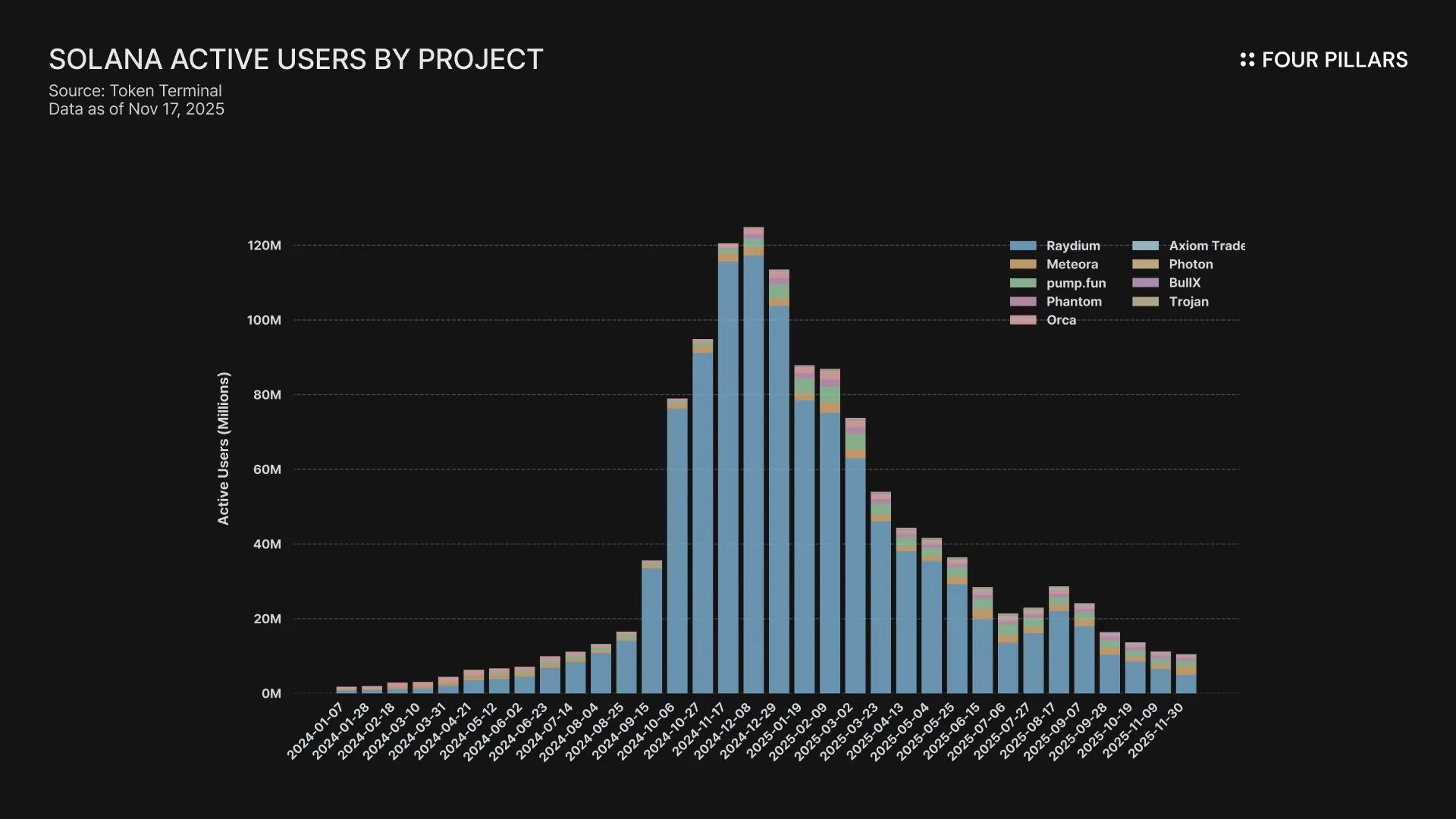然而,Solana 同时也是以 memecoin 为中心的 degens 最大的游乐场,Solana 上几乎所有的用户交互(DeFi 除外)都来自 memecoin Launchpad。问题是,Solana 的 memecoin 相关活动在 2025 年与 2024 年相比显著减少,似乎反映了 Solana 最近的方向。 Pump.fun 毕业代币的数量在 1 月份超过 800 个,现在仅略超过 70 个,Solana 链的每日活跃用户数保持在 1000 万左右,比 1 月份的 8000 万减少了 80%。此外,由于其独特的 MEV 环境难以实施 CLOB,因此它在最近以 PerpDEX 为中心的 meta 中没有表现出值得注意的活动。