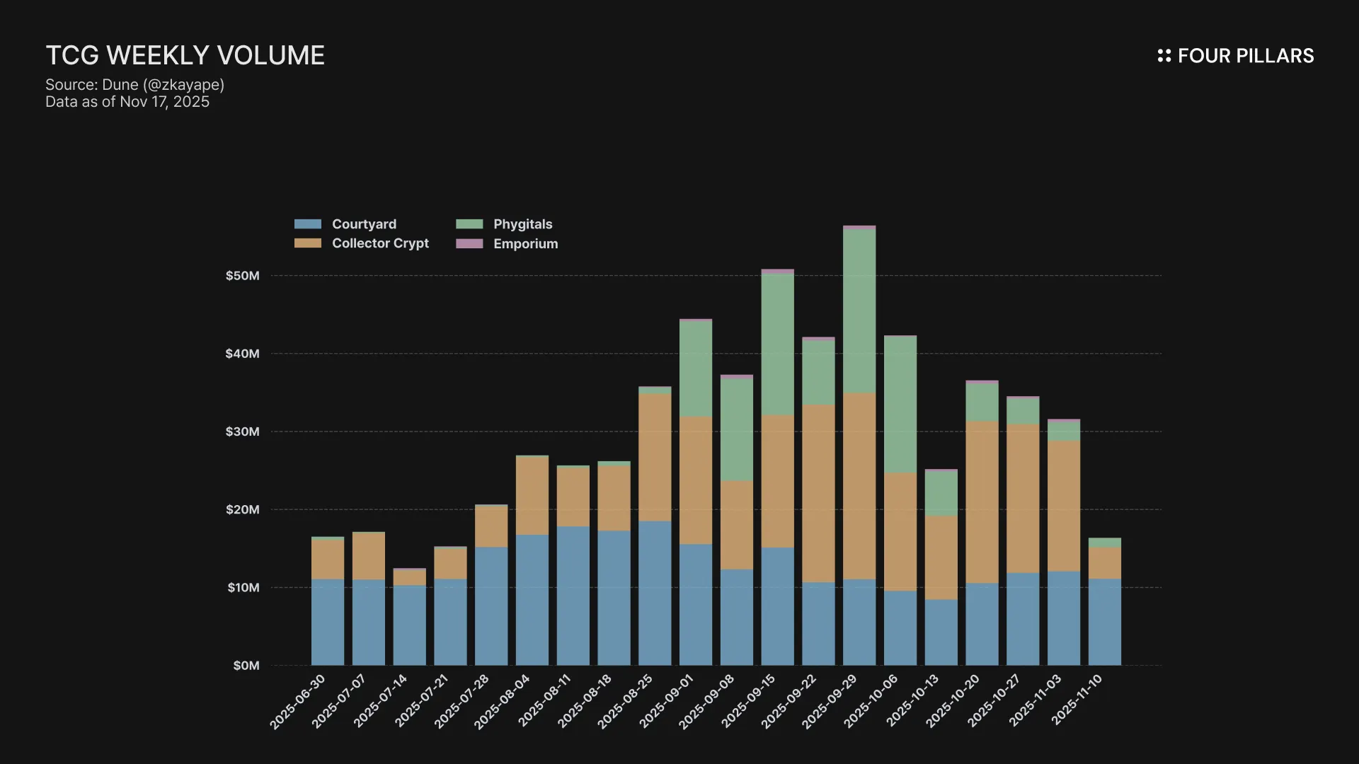 预计在 2026 年将显著增长的一个领域是以交易卡为中心的实体收藏品市场。收藏品市场今年已经经历了宝可梦卡片 gacha 和市场项目的兴衰,但这反而是一个明确揭示现有项目需要改进的地方的机会。在 2025 年脱颖而出的链上交易卡项目包括: