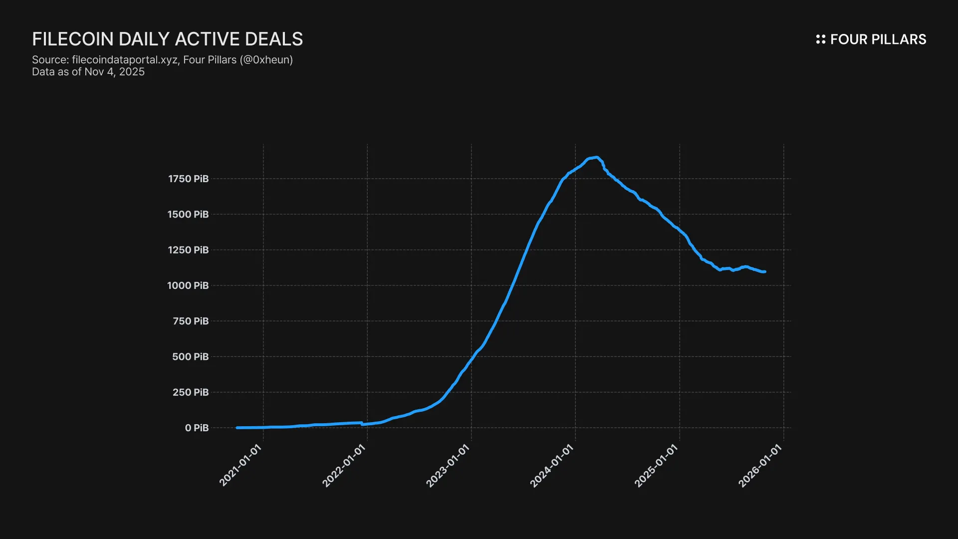 Filecoin 是最突出的例子。在通过 2017 年的 ICO 筹集了 2.5 亿美元之后,它被誉为去中心化存储的未来,并在 2020 年主网启动后迅速扩张。在 2024 年初,其每日活跃存储交易量达到 1,750 PiB 以上的峰值。然而,从那以后,这个数字下降到大约 1,000 PiB。这种下降并非完全由更广泛的市场停滞所致。开发人员必须学习一种全新的架构,而不是依赖 AWS S3 等熟悉的界面,并且普通用户发现数据上传和管理很麻烦。