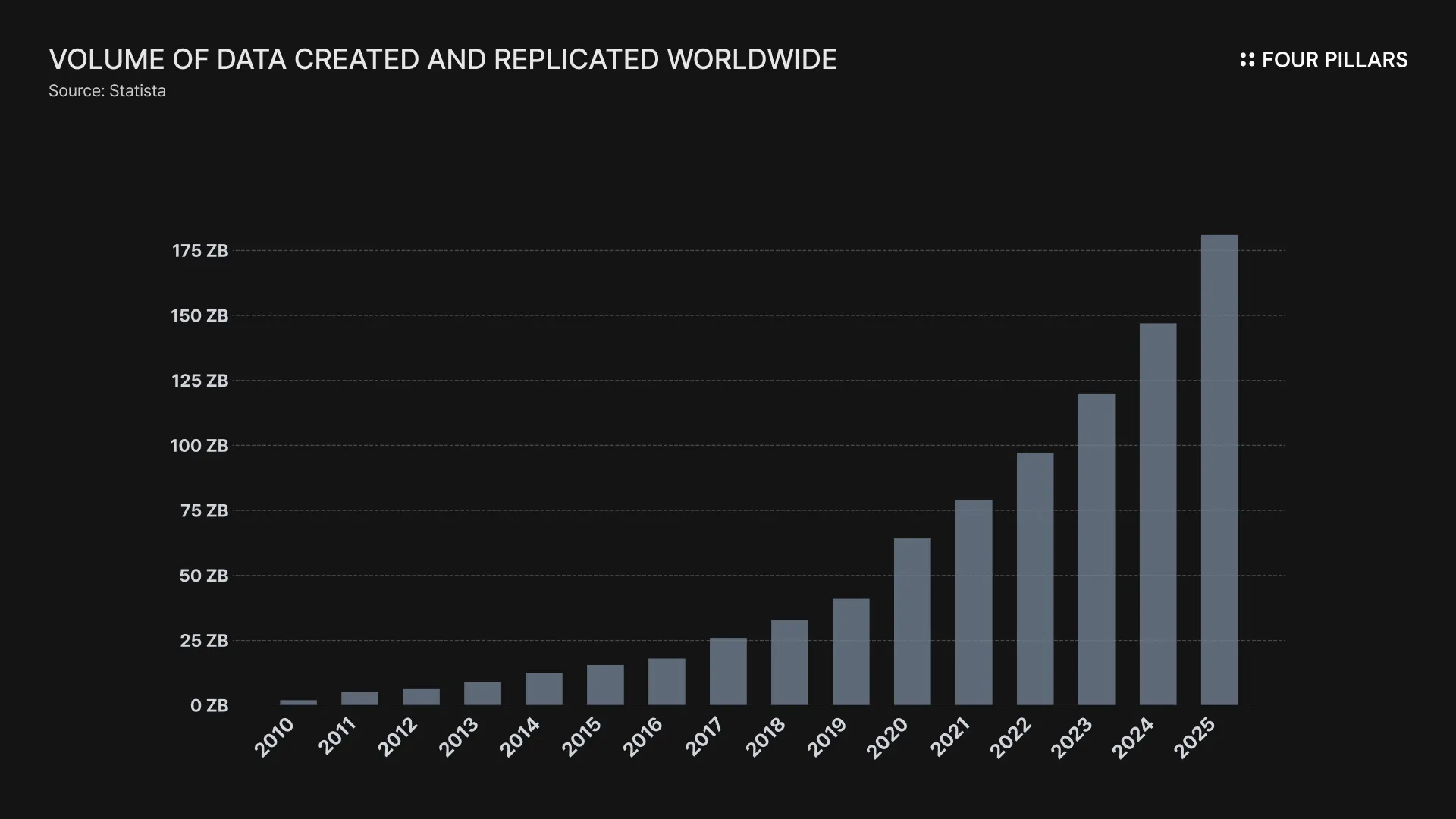 随着人工智能技术的快速发展和各种经济驱动因素的推动,数据已从次要资产演变为现代经济基础设施的核心组成部分。 根据 Statista 的数据, 互联网上产生的数据量每年增长 20% 以上,预计到 2025 年将达到约 180 泽字节(zettabytes)。