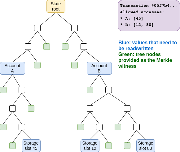 已经提出的一种解决此问题的主要策略是 强无状态。我们将要求进行交易的用户 (i) 指定其交易读取和写入的帐户和存储槽,并规定任何超出此集的尝试读取或写入都将失败,并且 (ii) 提供 Merkle 分支来证明其状态访问。