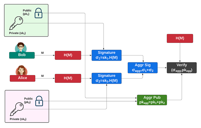 使用基于配对签名的最强大的技术之一,我们可以将签名聚合在一起,而仅使用公钥的聚合来验证。