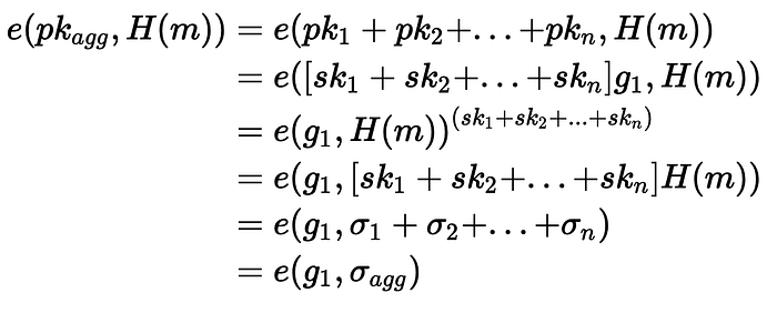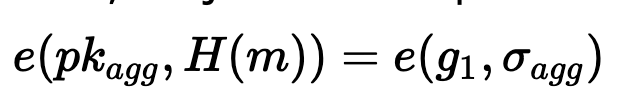 然后,我们能够使用配对操作的双线性进行聚合。对于聚合签名 ($\sigma_agg$),我们有一个对应的聚合公钥 ($pk_agg$),和一个公共消息 ($m$):