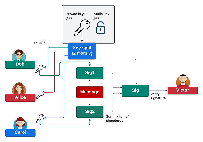 使用 BLS 签名最强大的元素之一是我们可以将私钥拆分为多个份额,然后使用这些份额来创建签名阈值。在以下示例中,我们将密钥拆分为 Bob、Alice 和 Carol 的三个部分,并定义任何两个共享可以重新组合在一起以签署消息: