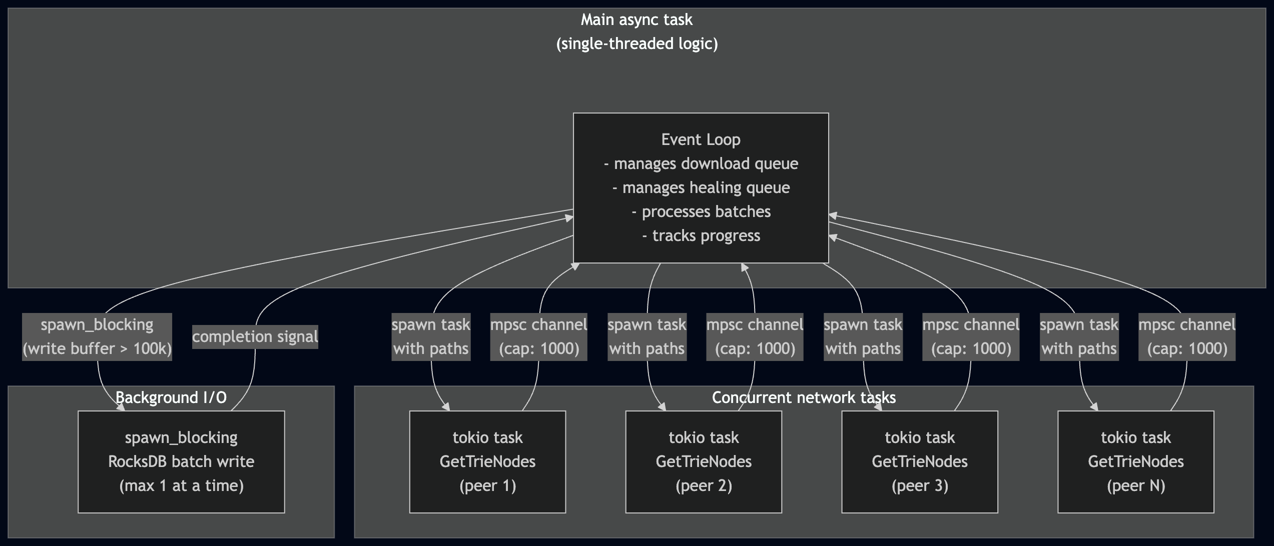 5. 刷新到数据库:当写入缓冲区超过 100,000 个节点,或完成/过期时。一个 spawn_blocking 任务处理写入——一次只有一个,以防止乱序写入可能违反子树不变量。