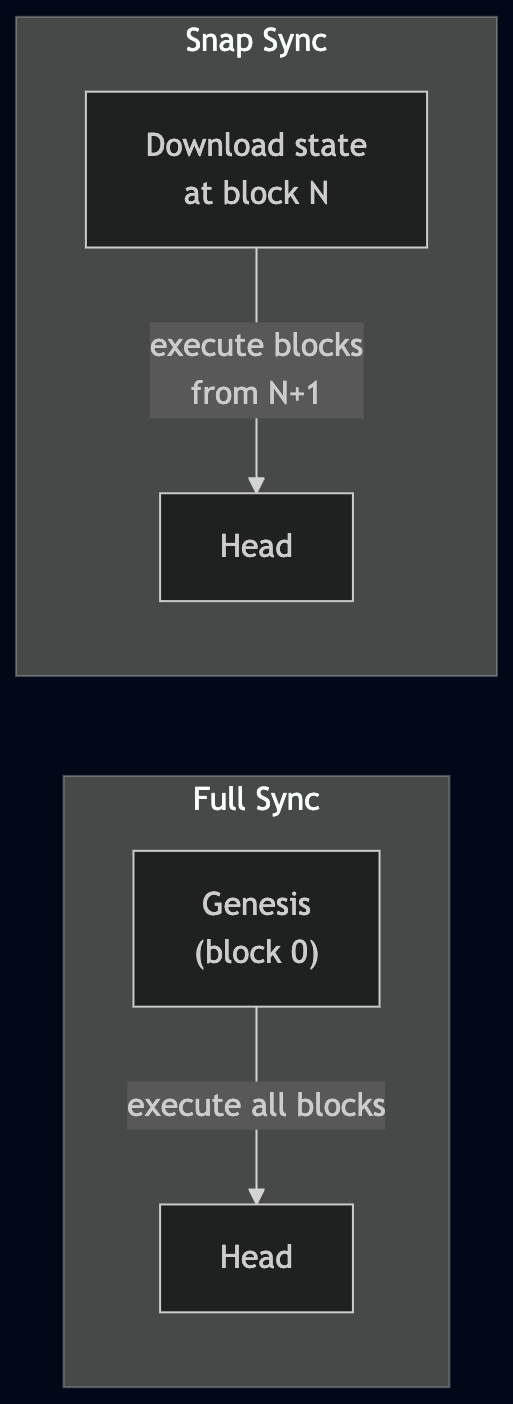 这意味着,要开始运行,一个节点需要一个初始状态。对于运行全同步的节点,该状态就是 genesis —— 区块 0 处的硬编码状态。然后,节点会重新执行所有已生成的区块以达到当前状态。