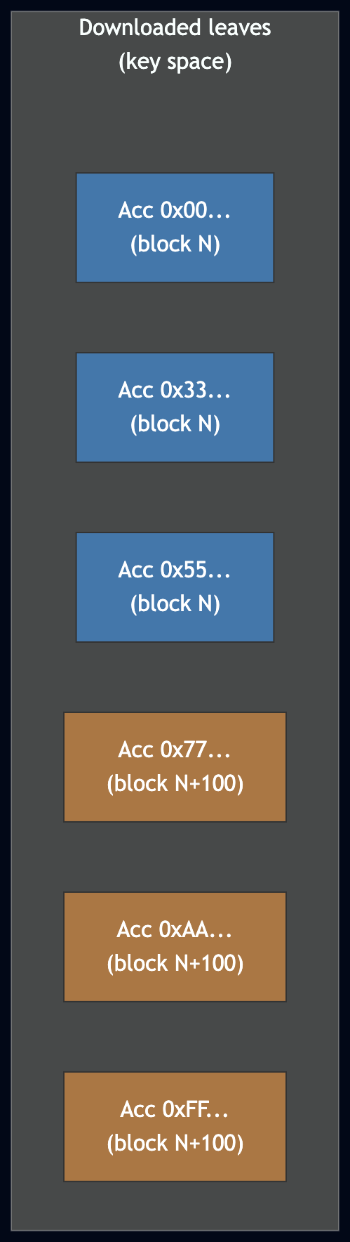 从两个不同的枢轴点下载的 Leaves。蓝色 leaves 来自区块 N,橙色来自区块 N+100。这些区块之间某些账户可能已发生变化,因此合并后的集合不代表任何真实状态。
