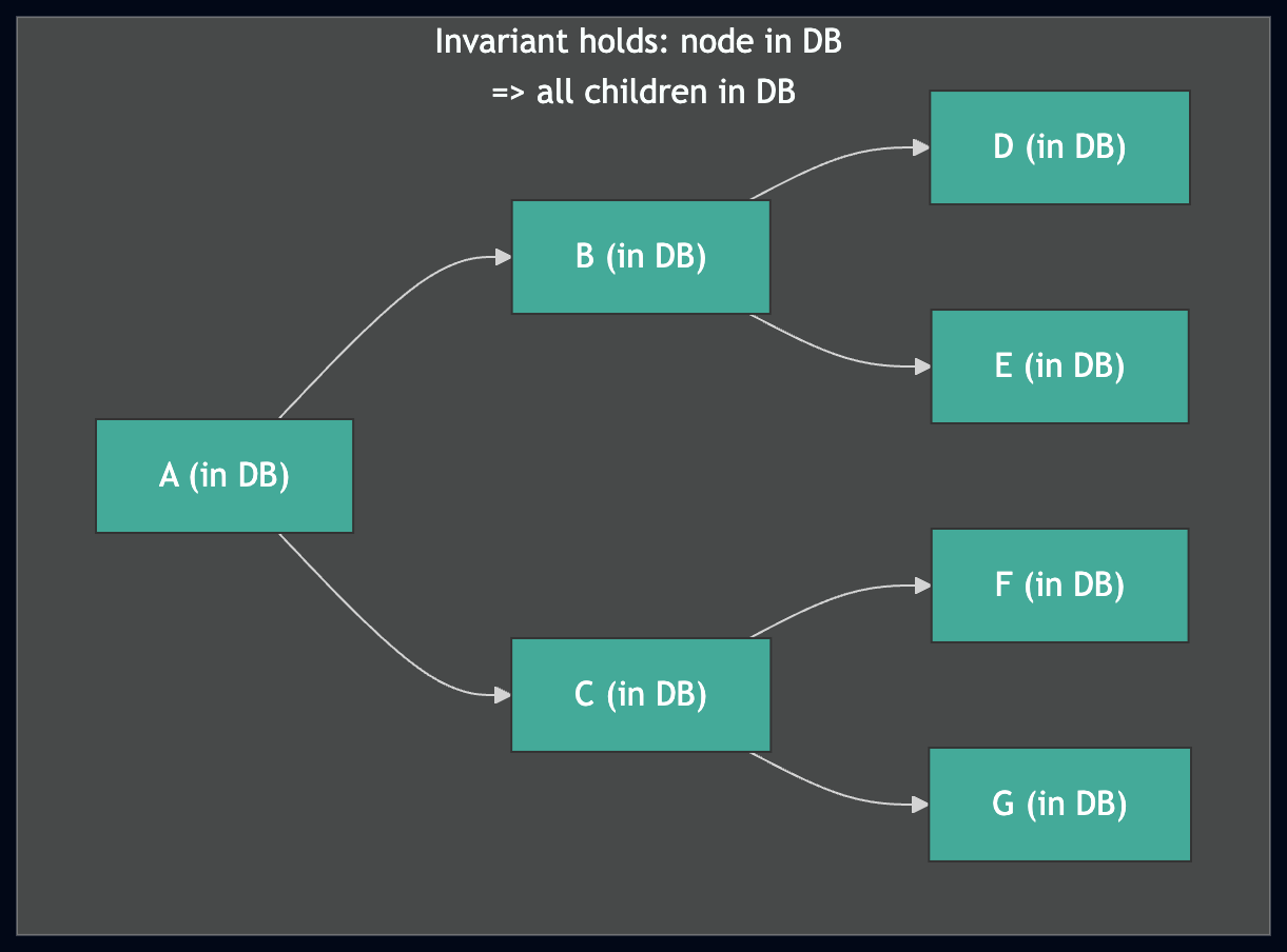 这个不变量是愈合高效的原因。当自上而下遍历 trie 时,如果遇到一个已在数据库中的节点,我们可以跳过整个子树——我们知道它下面的所有内容都已存在。