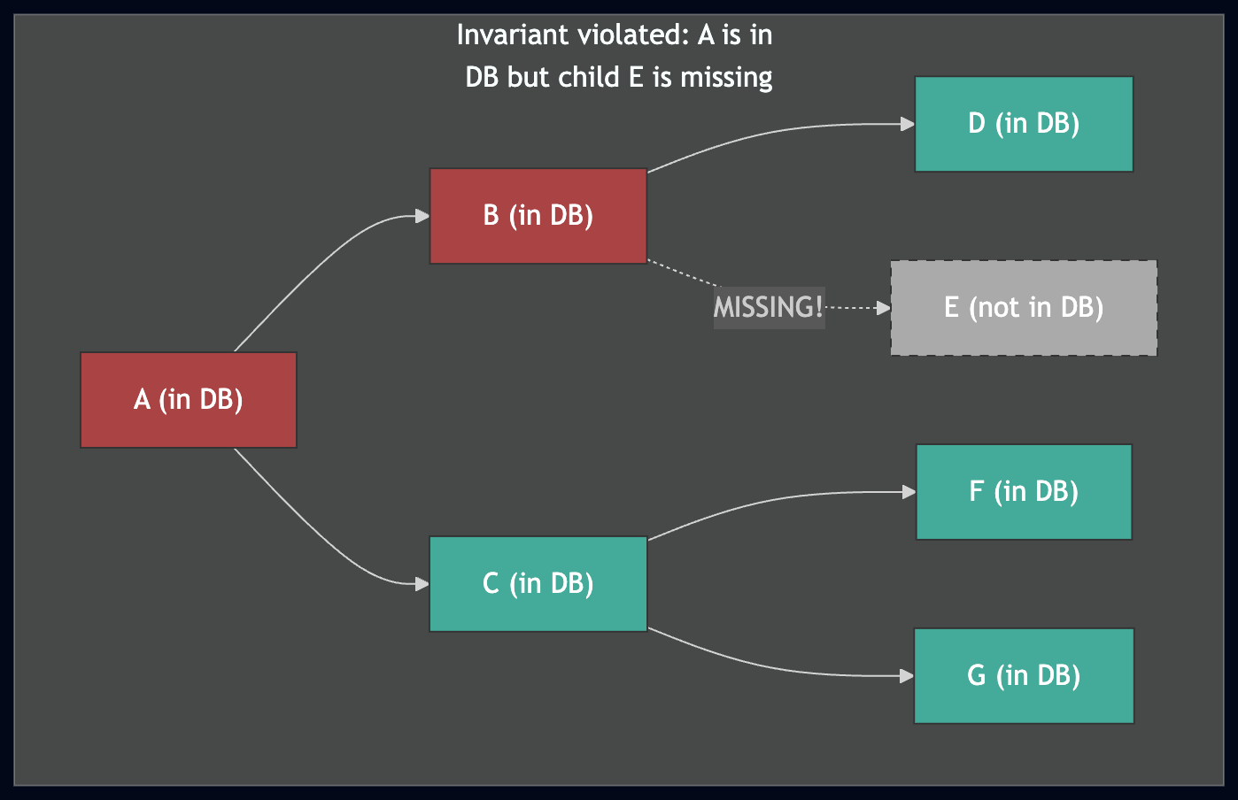 上图:不变量成立——如果愈合器在数据库中找到 A,它可以安全地跳过整个子树。下图:如果不变量被违反(E 缺失),愈合器将跳过 A 的子树,永远不会发现间隙,从而导致损坏的 trie