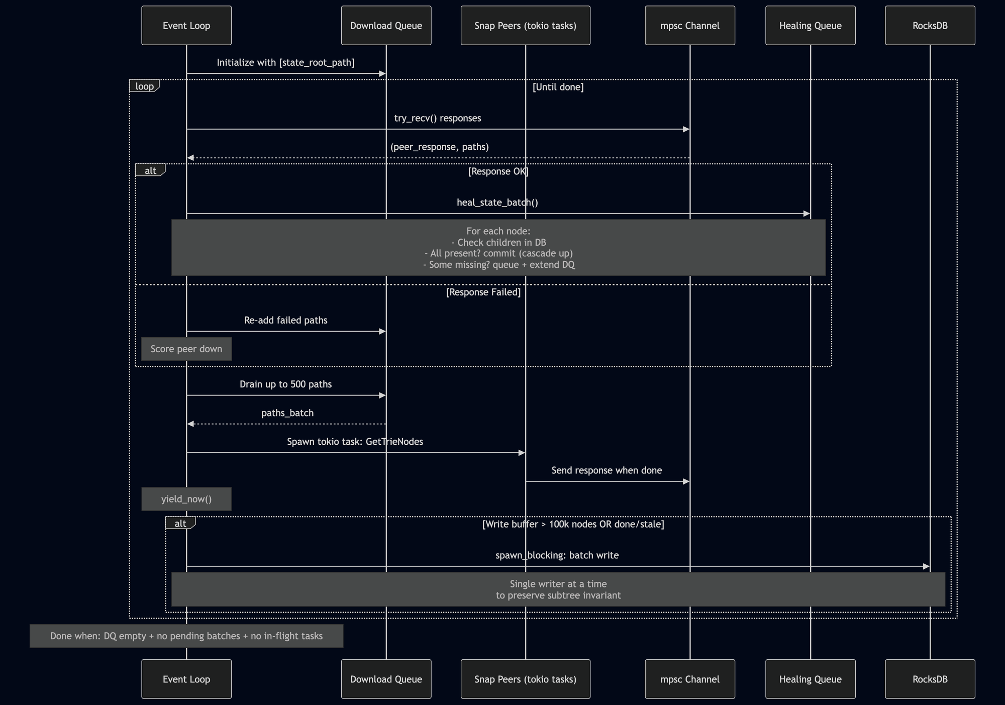状态愈合算法(state.rs 中的 heal_state_trie)是一个异步事件循环:
