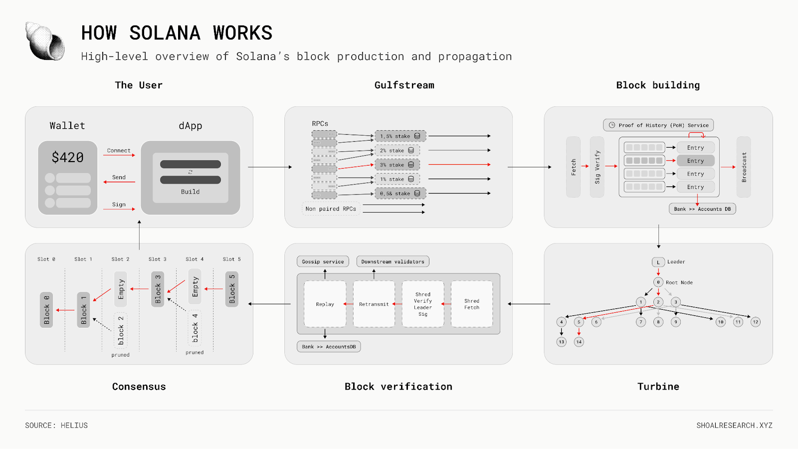 Solana 被设计为一个高速流式系统。理论上,验证者应在整个Slot期间持续打包交易,同时通过 Turbine 将区块数据广播为数据碎片(shreds)。这使得网络的其余部分能够近乎实时地重建和重放区块。