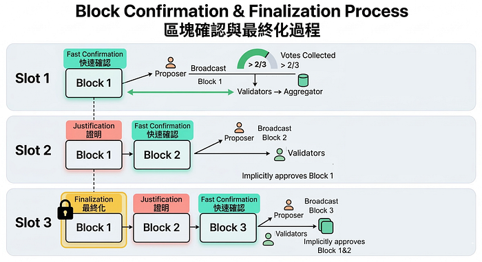對於絕大多數的 DApp 使用者、L2 排序器(Sequencer)或是中心化交易所而言,當 Slot 1 結束,區塊收集到超過 2/3 驗證者的第一張合併選票時,該區塊就已經达成了 「快速确认(Fast Confirmation)」。